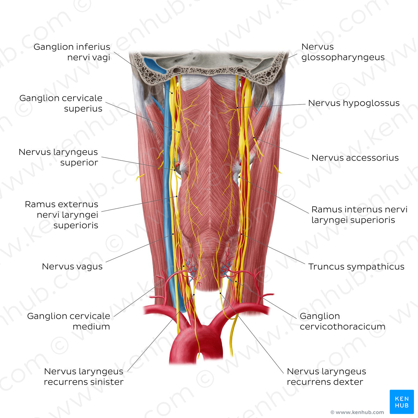 In this posterior view we can see the nerves that supply the pharynx and other important nervous structures of the spatium parapharyngeum. The plexus pharyngeus is mainly composed of pharyngeal branches of the n. glossopharyngeus and n. vagus. This plexus lies on the external surface of the pharynx. On the right side of the image, superiorly, we have a glimpse of the n. glossopharyngeus (CN IX) after leaving the skull through the foramen jugulare. The n. vagus (CN X) also leaves the skull through this foramen and has two sensory ganglia in this location - in this image we can see the ganglion inferius. The n. laryngeus superior arises from the ganglion inferius of the n. vagus and descends against the lateral wall of the pharynx. It divides into the ramus externus and ramus internus. The n. laryngeus recurrens is also a branch of the n. vagus that supplies the larynx. The right and left nerves are not symmetrical, with the left nerve looping under the arcus aortae, and the right nerve looping under the a. subclavia dextra then traveling upwards. The n. accessorius (CN XI) also passes through the foramen jugulare and courses through the neck; it pierces the m. sternocleidomastoideus which it innervates. The n. hypoglossus (CN XII) leaves the skull, travels down the neck and ends at the base and underside of the tongue, being responsible for its nerve supply. The cervical truncus sympathicus lies behind the vagina carotidis (a condensation of deep fascia of the neck in which is embedded the a. carotis communis and interna, v. jugularis interna, and the n. vagus). This trunk contains three interconnected ganglia: the superius, medium and inferius (stellate or cervicothoracicum).