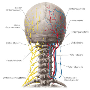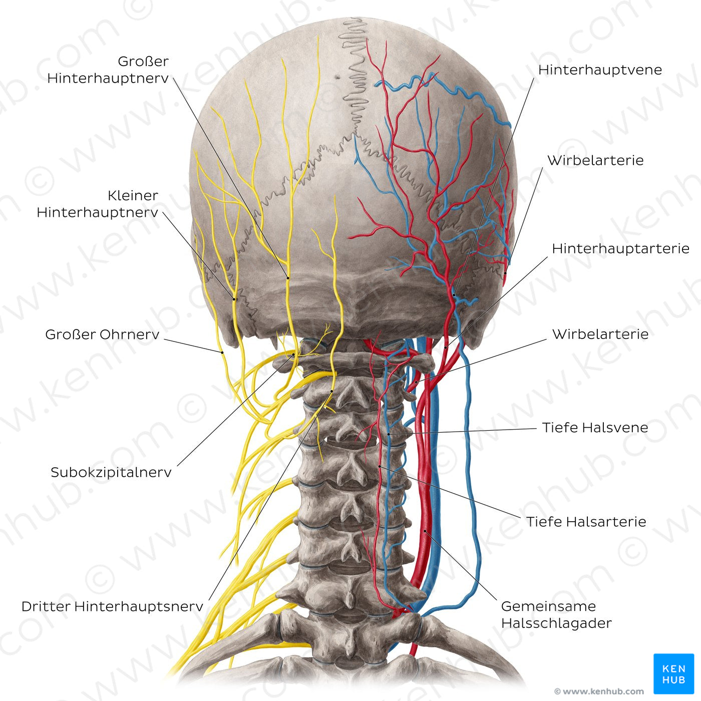 Die wichtigsten Arterien des Halses sind die Halsschlagadern, Wirbelarterien und Hinterhauptsarterien. Die gemeinsame Halsschlagader verläuft nach kranial in der Halsregion und spaltet sich in die äußere und innere Halsschlagader auf. Die innere Halsschlagader verläuft weiter nach kranial und versorgt Strukturen innerhalb der Schädelhöhle, während die äußere Halsschlagader Äste abgibt, die die Strukturen des Halses und des Gesichts versorgen. Die paarigen Wirbelarterien stammen aus den Unterschlüsselbeinarterien in der Radix colli, verlaufen nach kranial durch die Querfortsatzlöcher der Halswirbel C1-C6 und versorgen die hinteren Anteile der Schädelhöhle.Die wichtigsten Venen des Halses sind die inneren, äußeren und vorderen Drosselvenen. Die venösen Zuflüsse verlaufen parallel zu den entsprechenden arteriellen Gefäßen, z. B. die tiefen Halsvenen und die Wirbelvenen.Mehrere Hirnnerven und periphere Nerven verlaufen durch den Hals und versorgen seine Strukturen. Das Halsgeflecht befindet sich im kranialen Anteil des Halses, gibt Äste wie den kleinen Hinterhauptnerv und den großen Ohrnerv ab, die sensibel und motorisch viele Strukturen des Halses sowie Anteile des Gesichts, der Achselregion, der Deltaregion und der Thorax innervieren. Die Halsnerven (Spinalnerven C1-C3) wie der Subokzipitalnerv und der große Hinterhauptnerv innervieren Strukturen des Kopfes und des dorsalen Halses.