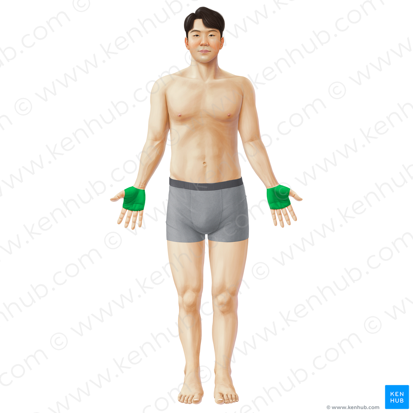 Shown from anterior perspective. Also known as Volar region of hand, and Palmar region of hand.