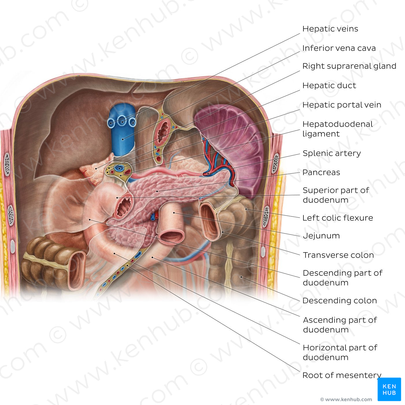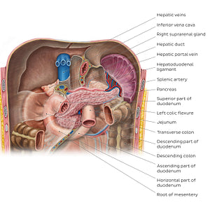 The pancreas is an elongated organ which lies mainly retroperitoneally across the posteriorabdominal wall. It can be divided into five anatomical parts: head, neck, body, tail and uncinate process. The descending and horizontal parts of the C-shaped duodenum wrap around the pancreatic head. The aorta, superior mesenteric artery, left renal vessels, left kidney, and left suprarenal gland are situated posterior to the pancreatic body. The tail is the last part of the pancreas and lies intraperitoneally. It is situated in close proximity to the hilum of the spleen and runs with the splenic vessels in the splenorenal ligament.