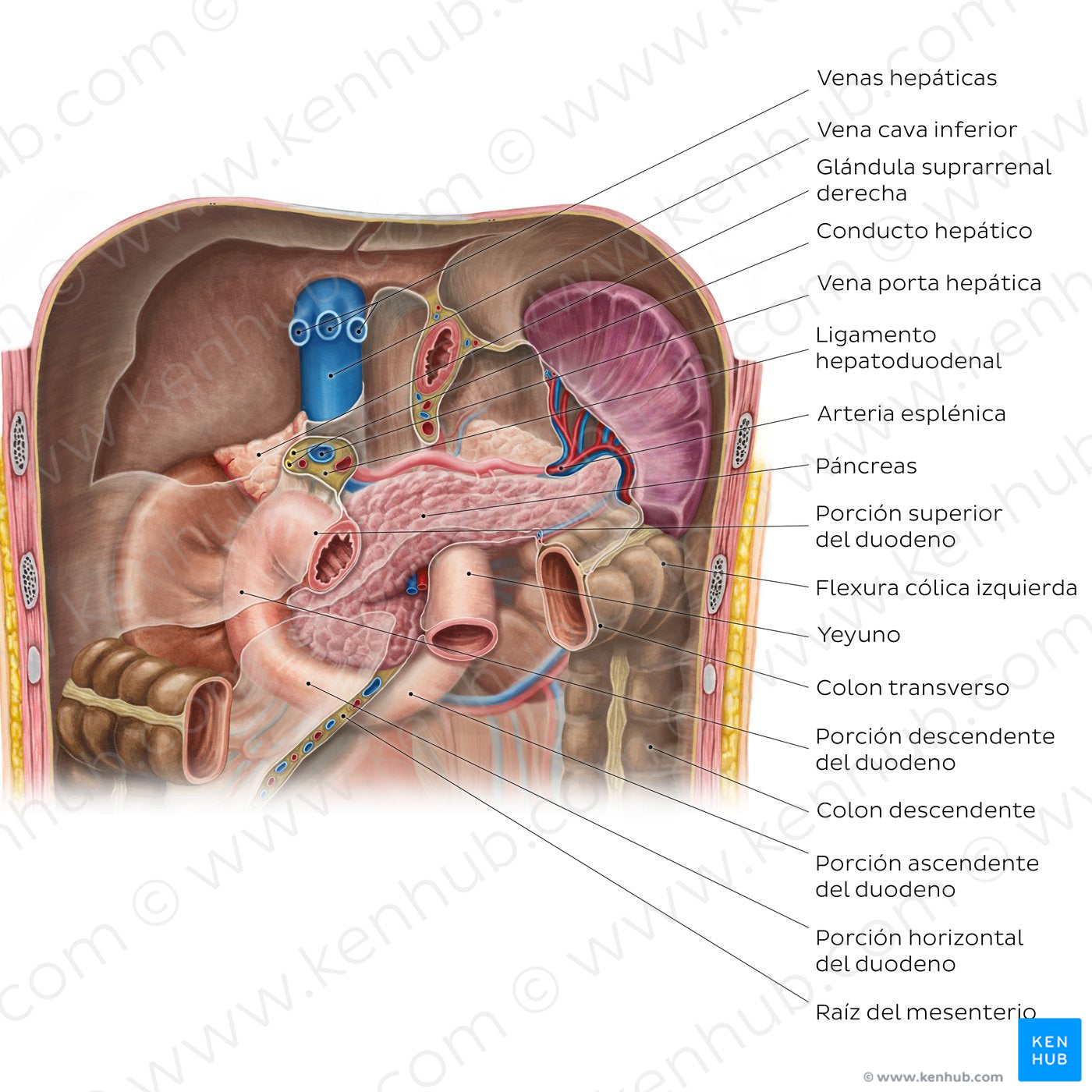 El páncreas es un órgano alargado y principalmente retroperitoneal, situado horizontalmente a lo largo de la pared abdominal posterior.Se puede dividir anatómicamente en 5 porciones: proceso unciforme, cabeza, cuello, cuerpo y cola del páncreas. Las porciones descendente y horizontal del duodeno se envuelven alrededor de la cabeza del páncreas. La aorta, arteria mesentérica superior, vasos renales izquierdos, riñón izquierdo y glándula suprarrenal izquierda están situados posteriormente al cuerpo del páncreas. La cola es la última porción del páncreas y es intraperitoneal. Se ubica muy cerca del hilio del bazo en el interior del ligamento esplenorrenal junto con los vasos esplénicos