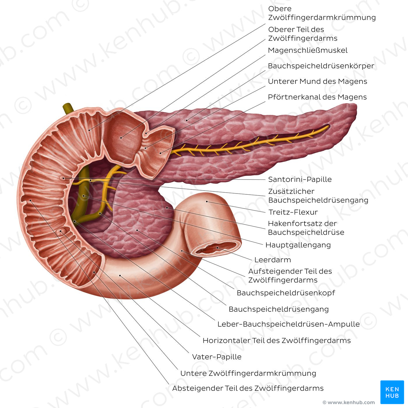 Das Gangsystem der Bauchspeicheldrüse und die Darmwand des proximalen Zwölffingerdarms sind zu sehen.Der Bauchspeicheldrüsengang (Wirsung-Gang) verläuft vom Schwanz zum Kopf des Pankreas. Zusammen mit dem Hauptgallengang bildet er die Leber-Bauchspeicheldrüsen-Ampulle (Ampulla Vateri), die über die große Zwölffingerdarmpapille in den Zwölffingerdarm mündet. Zahlreiche kleine interlobuläre Ausführungsgänge münden in den Bauchspeicheldrüsengang. Der zusätzliche Bauchspeicheldrüsengang drainiert den Bauchspeicheldrüsenkopf und mündet über die kleine Zwölffingerdarmpapille in den Zwölffingerdarm. Im Bereich des Bauchspeicheldrüsenhalses ist er mit dem Bauchspeicheldrüsengang verbunden.