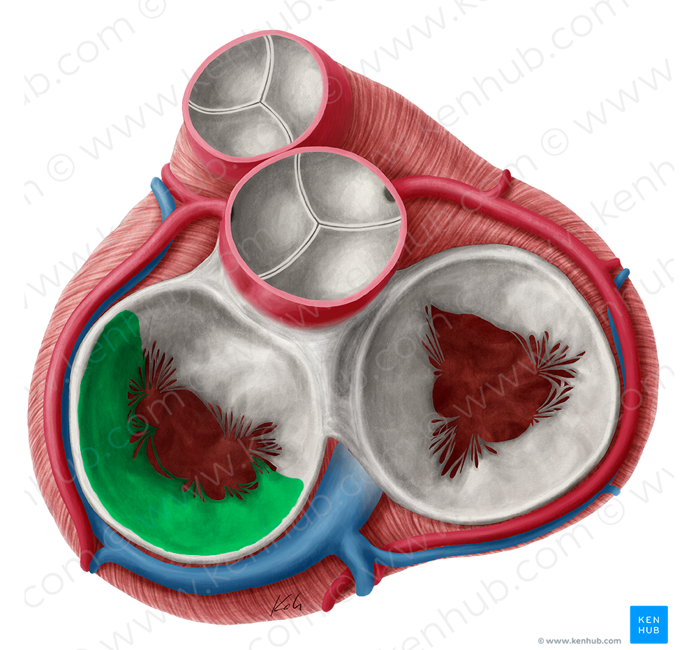 Shown from superior perspective. Also known as Mural leaflet of left atrioventricular valve, and Posterior leaflet of mitral valve.