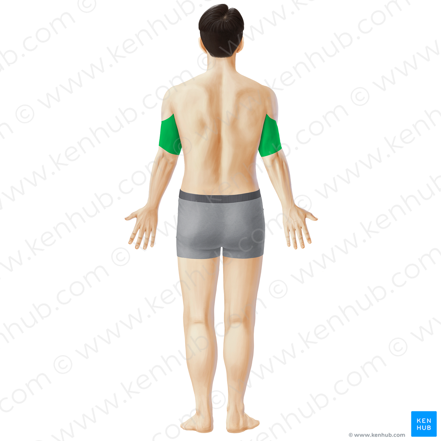 Shown from posterior perspective. Also known as Posterior brachial region.