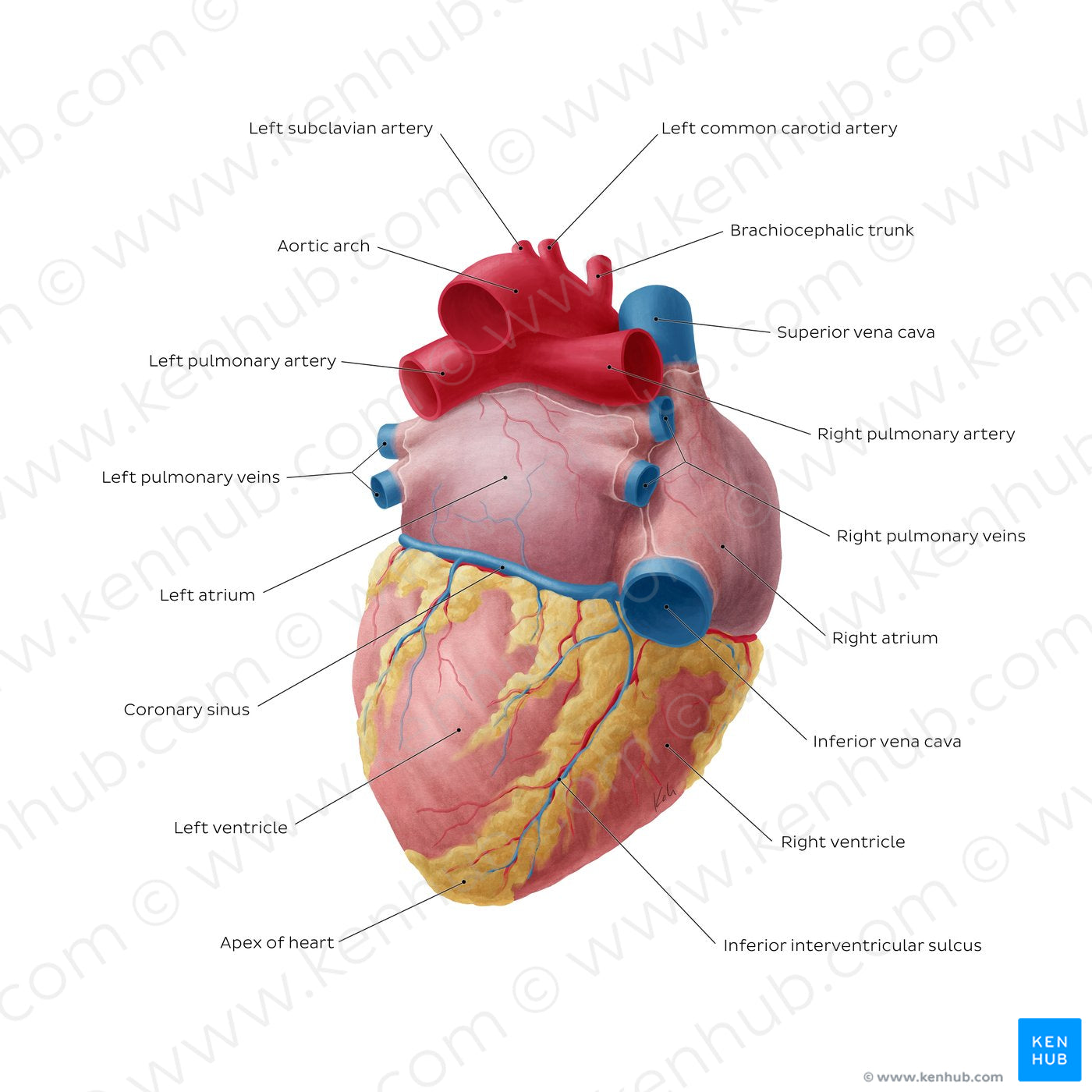 In the posteroinferior view of the heart, we can get a clear visual of the inferior and posterior surface (base) of the heart. The inferior surface is mostly made up of the left ventricle and part of the right ventricle and gently slopes anteroinferiorly from the base of the heart towards the apex. It is separated from the anatomical base (posterior surface) of the heart by the posterior part of the coronary sulcus. The inferior surface is also marked by the inferior (a.k.a. posterior) interventricular sulcus, which separates the ventricles and contains the inferior (posterior) interventricular artery and middle cardiac vein. The posterior surface is largely formed by the left atrium which is pierced by four pulmonary veins, as well a small portion of the right atrium which receives the superior and inferior venae cavae. The atria are separated by a shallow interatrial sulcus, which together with the coronary and inferior interventricular sulci, form the crux of the heart.