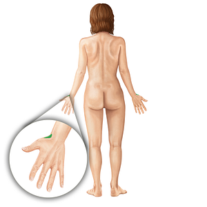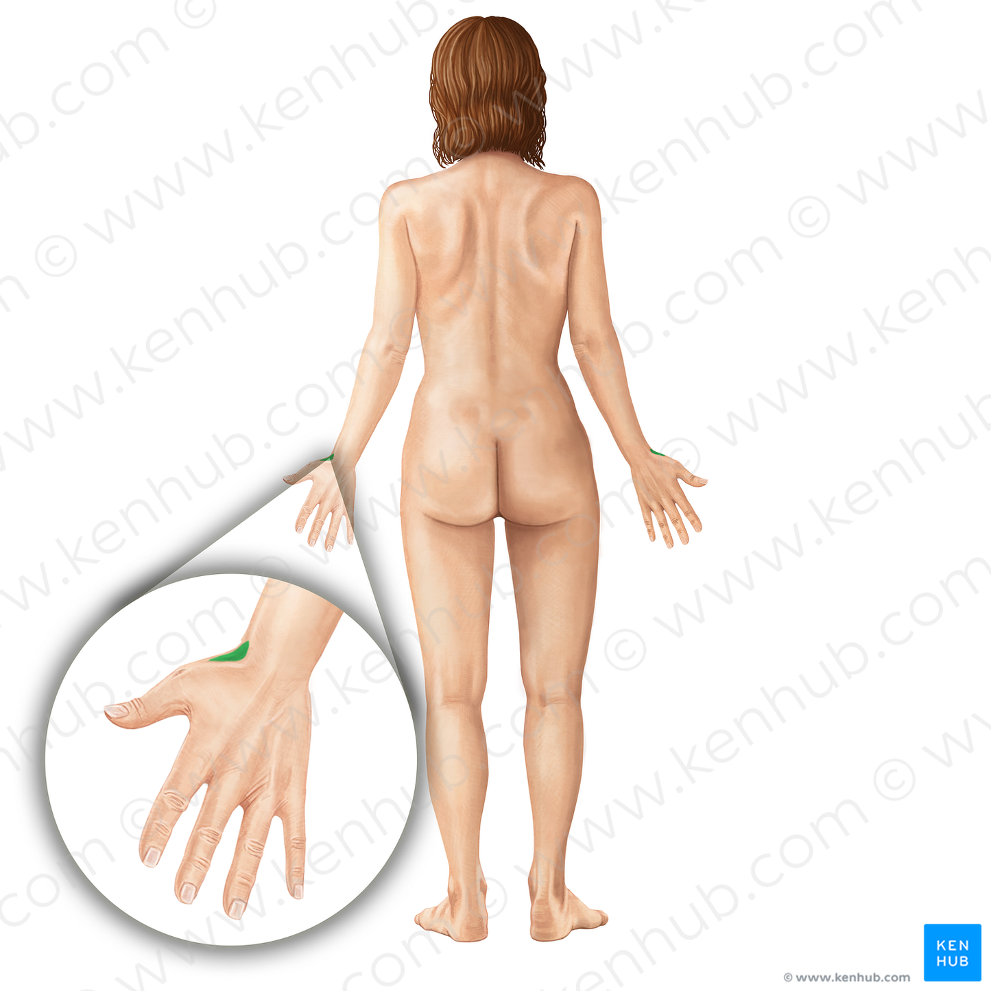 Shown from posterior perspective. Also known as Anatomical snuffbox, Radial fossa, and Radial fovea.