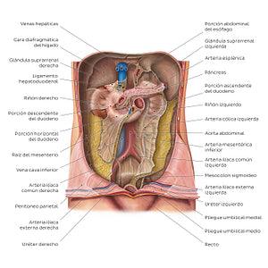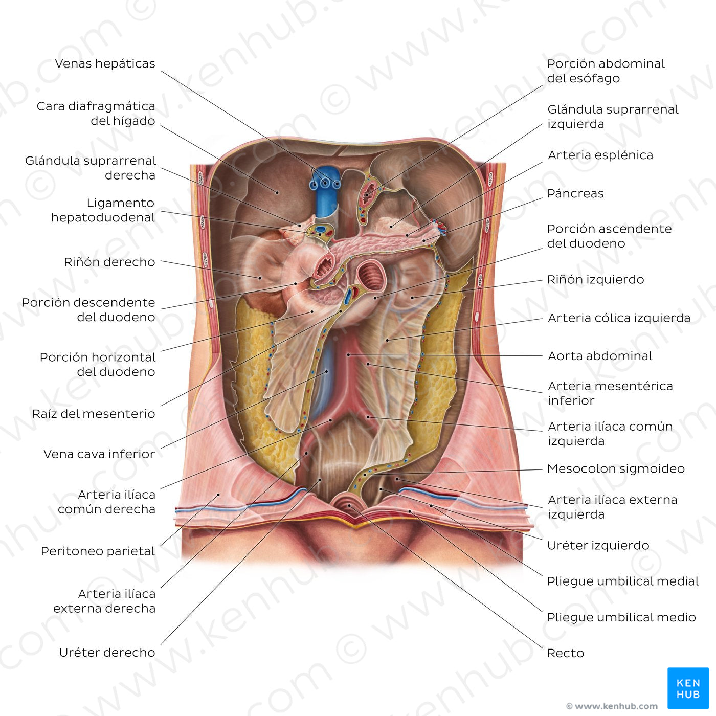 Los órganos del retroperitoneo como su palabra lo indica, se encuentran posterior a la cavidad peritoneal en el espacio retroperitoneal, estando solamente su pared anterior recubierta por el peritoneo parietal. Si estos órganos se desarrollan y permanecen fuera del peritoneo, se denominan órganos retroperitoneales primarios; estos incluyen a los riñones, las glándulas suprarrenales, los uréteres, la aorta, la vena cava inferior y el recto. Los órganos retroperitoneales secundarios inicialmente se desarrollan dentro del peritoneo, pero se vuelven retroperitoneales al perder su mesenterio durante el desarrollo embriológico. Estos incluyen al páncreas, el duodeno distal, el colon ascendente y el colon descendente.