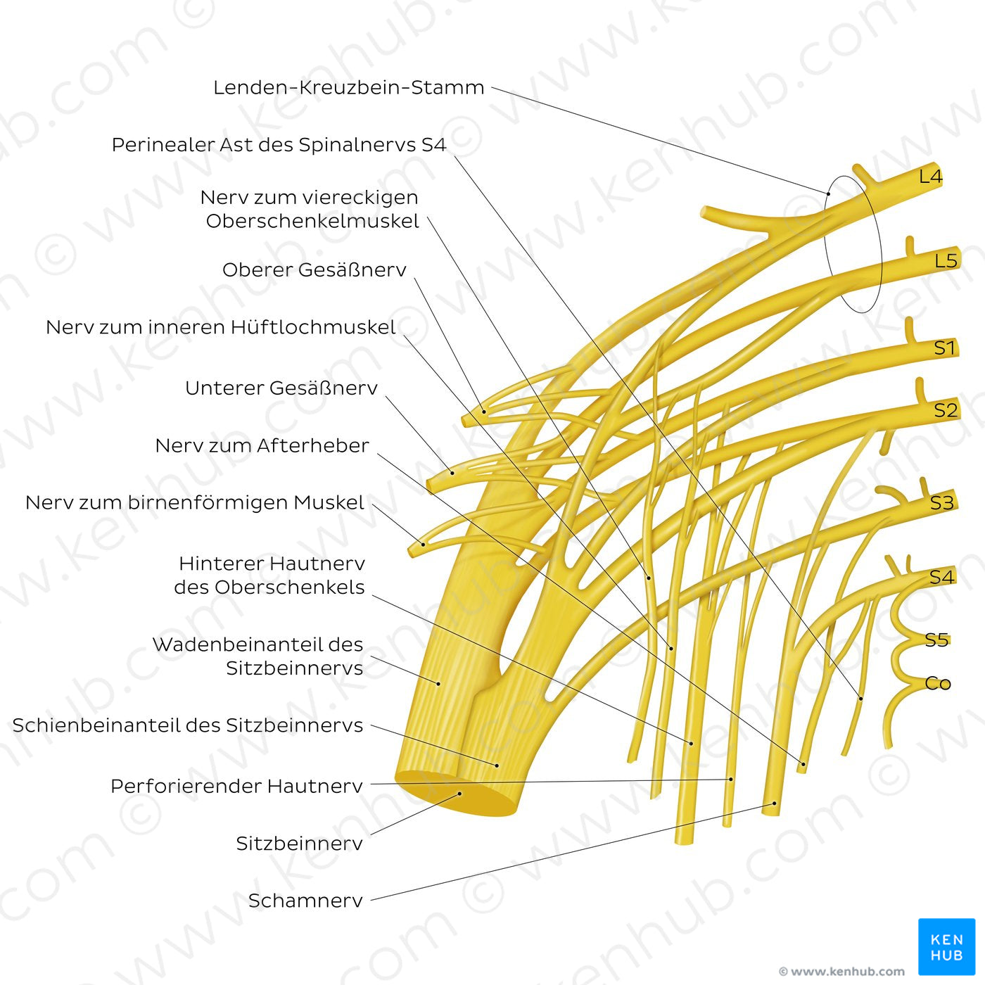 Auf der rechten Seite sind die Spinalnerven L4 bis S5 abgebildet, die jeweils einen vorderen und einen hinteren Ast abgeben. Das Kreuzbeingeflecht wird aus den vorderen Ästen der Spinalnerven L4 bis S4 gebildet, während die aus S5 stammenden vorderen Äste sowie der Steißbeinnerv zusammen das Steißbeingeflecht bilden. Die vorderen Äste der Spinalnerven teilen sich weiter in vordere und hintere Abzweigungen auf, aus denen jeweils wiederum zahlreiche Äste hervorgehen. Sie laufen zu den Nerven des Kreuzbeingeflechts zusammen. Aus den Wurzeln der Spinalnerven L4-S3 geht der Sitzbeinnerv hervor. Dieser teilt sich in seinem Verlauf in den Schienbeinnerv und den Gemeinsamen Wadenbeinnerv auf, um Bereiche im Oberschenkel, Bein und Fuß zu versorgen.