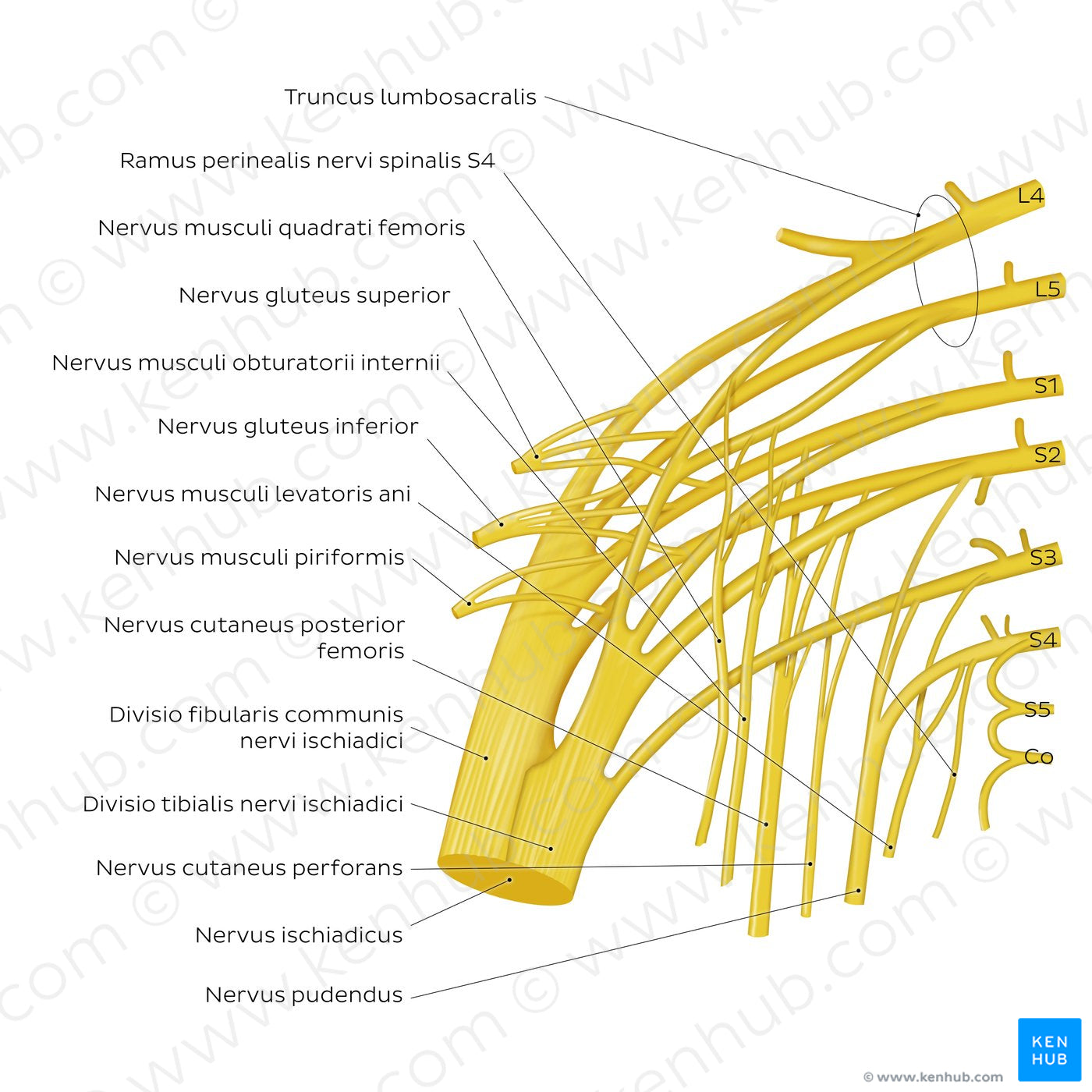 The nn. spinales L4-S5 are shown on the right hand side, each giving a ramus anterior and ramus posterior. The plexus is formed by the rami anteriores of the nn. spinales L4-S4, while the S5 root (radix) joins the coccygeal (Co) root (radix) to form the plexus coccygeus. The rami anteriores of nn. spinales further split into divisiones anteriores and divisiones posteriores and numerous branches arise from each division. They then join together to form the nerves of the plexus sacralis, which can be divided into rami anteriores and posteriores. The rami anteriores are the n. musculi quadrati femoris, n. obturatoris interni, n. pudendalis, n. levatoris ani and n. musculi coccygei. The rami posteriores are the n. musculi piriformis, n. gluteus superior, n. cutaneus posterior femoris, n. cutaneus perforans and nn. splanchnici pelvici. Continuations of nn. spinales L4-S3 converge together to form a single terminal branch (ramus terminalis), known as the n. ischiadicus. It splits into the n. tibialis and n. fibularis communis to supply structures of the thigh, leg and foot.