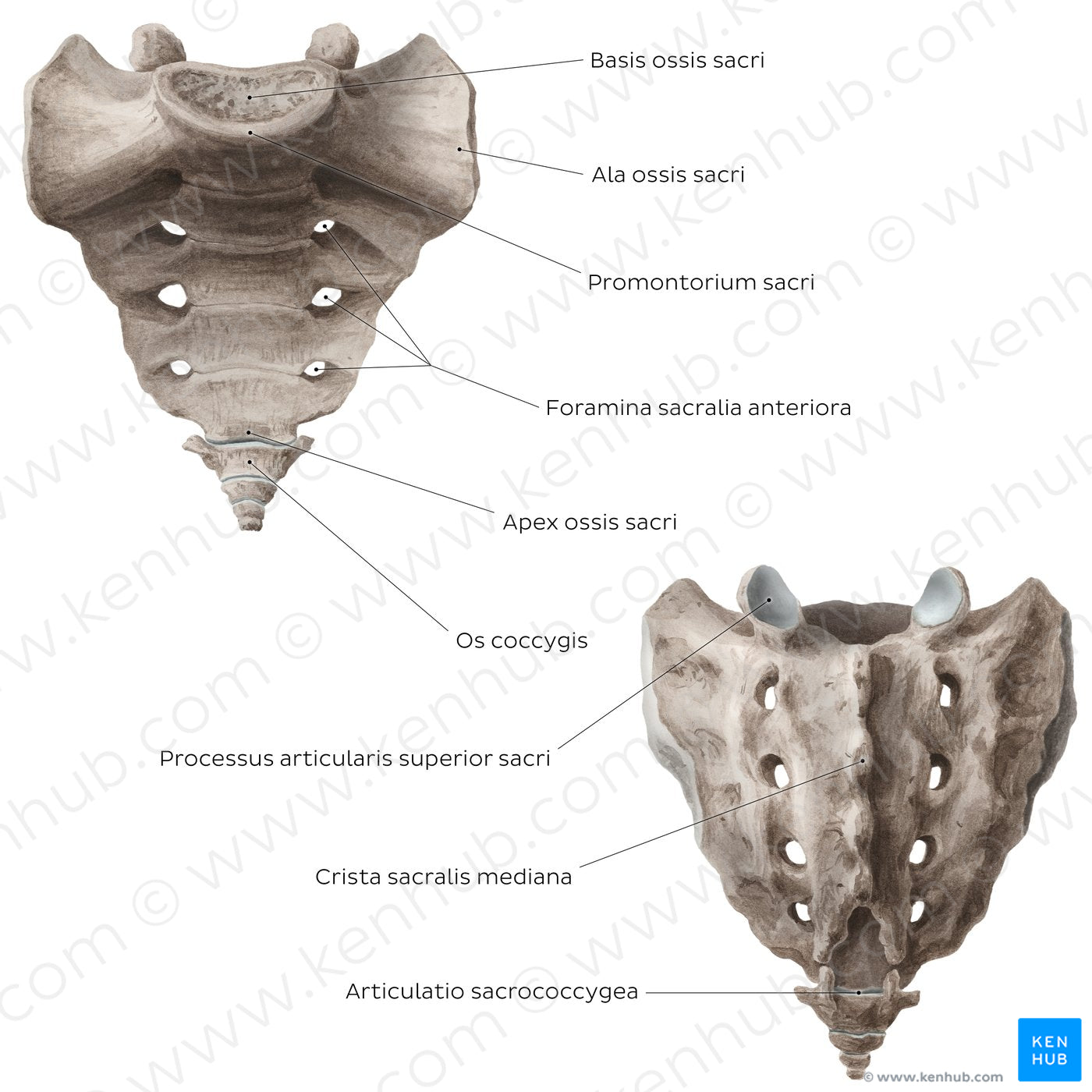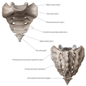 An anterior and posterior view of the os sacrum and os coccygis. The symphysis lumbosacralis is formed between the vertebrae L5 and S1. It consists of two separate articulations: the symphysis intervertebralis anterius formed by the L5/S1 discus intervertebralis and the two articulationes zygapophysiales posterior between their processus articulares. The symphysis lumbosacralis is strengthened and stabilised by the ligg. iliolumbale and ligg. lumbosacrales. The linea transversae located on the anterior or pelvic surface of the os sacrum indicate the site of fusion of each sacral vertebra. The articulatio sacroiliaca is formed by the synovial articulation between the os sacrum and os ilium anteriorly and by the syndesmoses between their tuberosities posteriorly. The articulatio sacroiliaca is stabilised by the ligamenta sacroiliaca anteriora, interossea and posteriora. An discus intervertebralis lies between the apex ossis sacri and basis ossis coccygis to form the secondary cartilaginous junctura sacrococcygea. Reinforcing this joint are the ligamenta sacrococcygea posteriora superficiale, posteriora profundum, anteriora and laterales, as well as the ligamenta sacrotuberale and sacrospinale. Stabilising the art. intercoccygea, which are frequently fused inferiorly, are the sacral portions of the ligamentum sacrospinale and ligamentum longitudinale anterius as well as the ligamenta sacrococcygea anteriora and laterales.