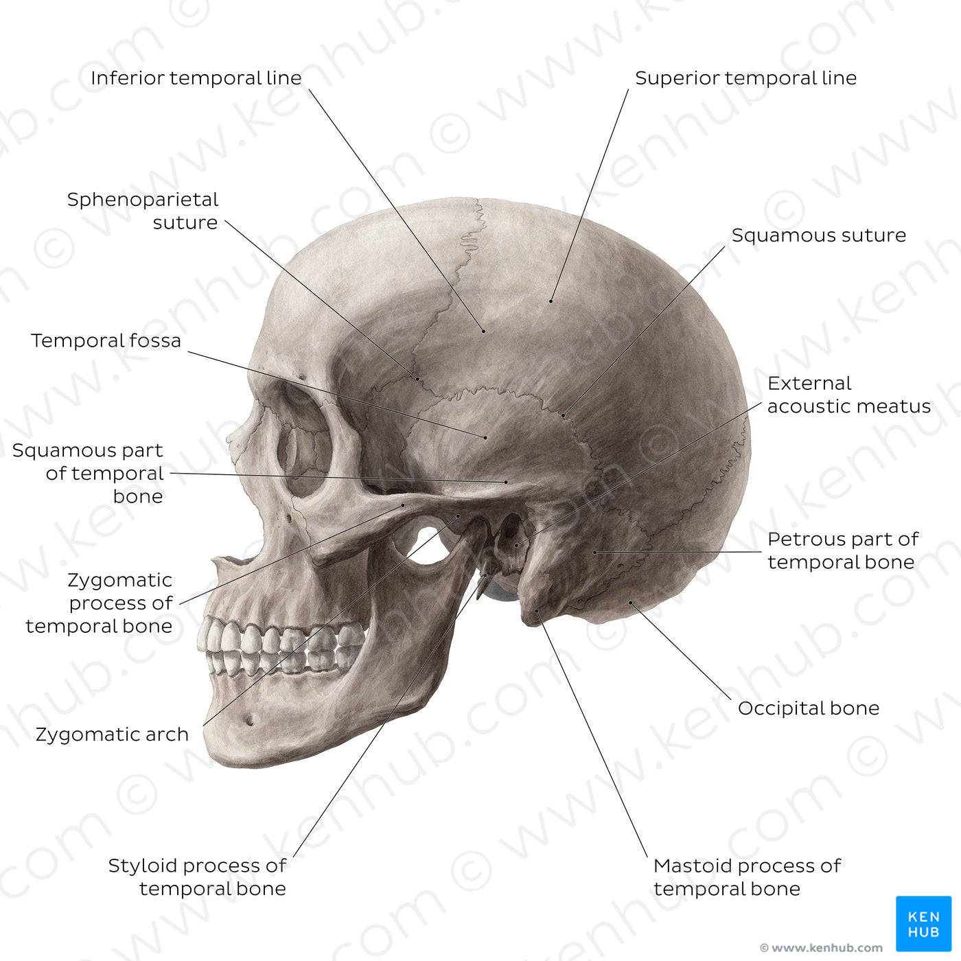 The frontal bone articulates with the zygomatic bone (frontozygomatic suture), the greater wing of the sphenoid bone (sphenofrontal suture) and the parietal bones (coronal suture). From this lateral perspective, the squamous and petrous part of the temporal bone are visible and are separated from each other by the zygomatic process. This zygomatic process unites with the temporal process of the zygomatic bone to form the zygomatic arch. The squamous part of the temporal bone articulates with the parietal bone superiorly (squamous suture) and with the greater wing of the sphenoid bone anteriorly (sphenosquamosal suture). The squamous part of the temporal bone and the greater wing of the sphenoid bone together form the majority of the temporal fossa. The external acoustic meatus is part of the tympanic portion of the temporal bone with the styloid process situated inferior, and the mastoid process posterior to it. The pterion is a point of intersection of frontal, sphenoid, parietal, and temporal bones.On this view, the occipital bone is seen articulating with the parietal bone superiorly and the petrous part of the temporal bone inferiorly.