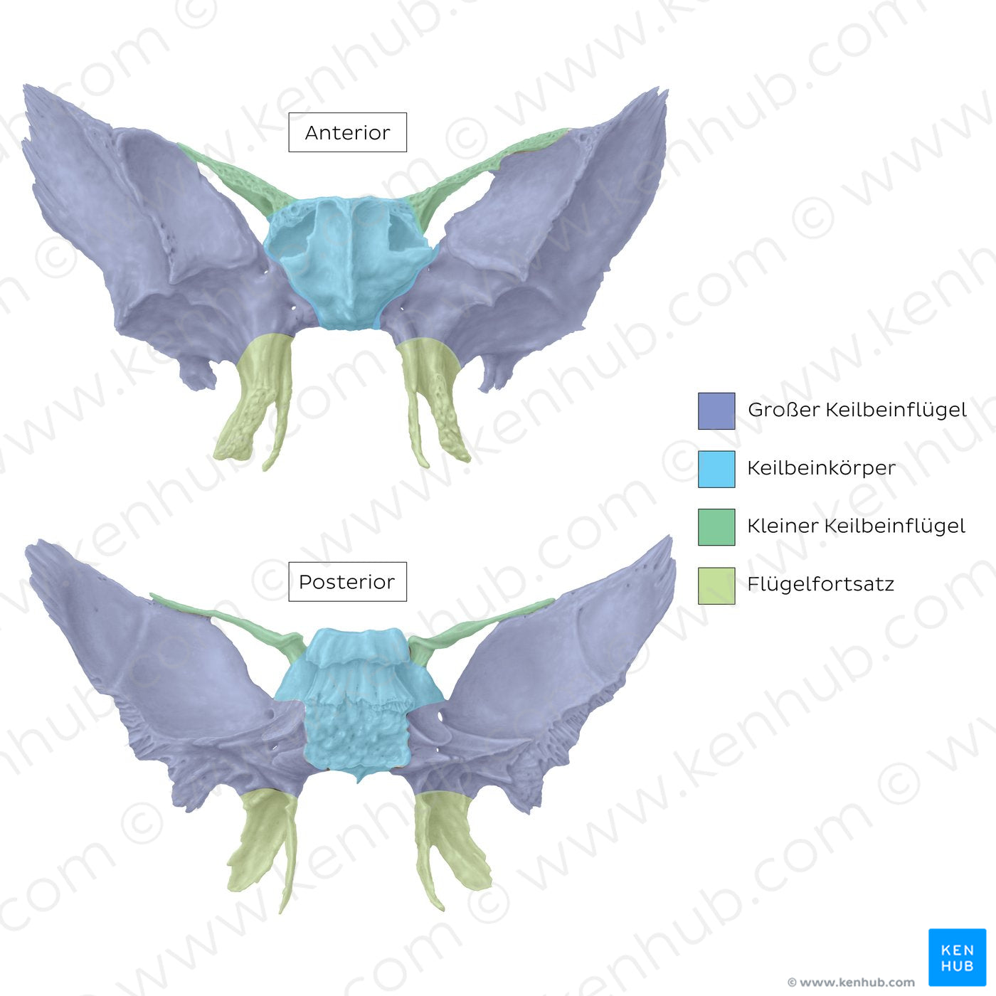 Das Keilbein ist von den Schädelknochen am komplexesten aufgebaut. Es besteht aus einem zentral gelegenen Keilbeinkörper, aus dem beidseits die paarigen Keilbeinflügel entspringen: die kleinen und die großen Keilbeinflügel. Der zweigeteilte Flügelfortsatz des Keilbeins entspringt aus jedem großen Keilbeinflügel und ist nach inferior ausgerichtet.