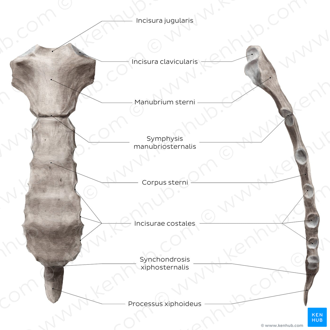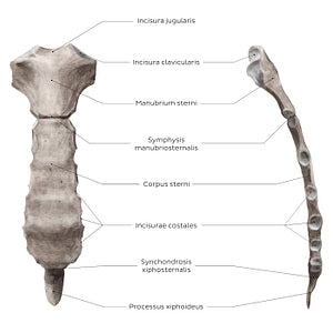 The manubrium sterni articulates with the corpus sterni at the symphysis manubriosternalis, and the corpus sterni with the processus xiphoideus sterni at the synchondrosis xiphosternalis. On the manubrium sterni, the incisura jugularis sterni is located centrally along its superior border and is flanked either side by the incisura clavicularis manubrii sterni which accommodate the sternal end of each clavicula. Directly below the incisura clavicularis manubrii sterni and along the length of the manubrium sterni and corpus sterni are seven paired incisurae costales which receive the cartilages of the (true ribs) costae verae. It’s important to note that the sternum articulates with the cartilagines costales and not directly with the ribs, through the articulationes sternochondrales. These joints allow slight movement of the cavitas thoracis and expansion when breathing.