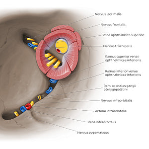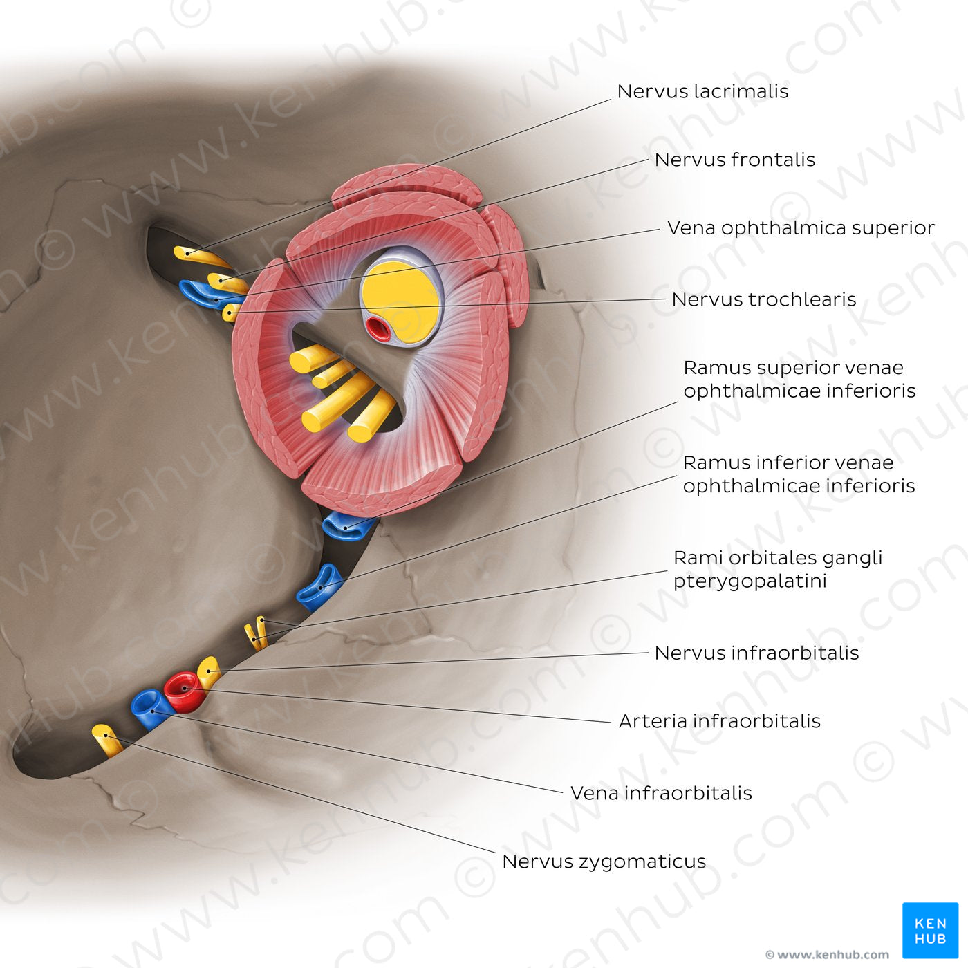 The fissura orbitalis superior is located superolateral to the canalis opticus and positioned between the ala minor and ala major of the os sphenoideum. The anulus tendineus communis is situated along the anteroinferior aspect of the fissura orbitalis superior. Several nerves and veins pass through the fissura orbitalis superior with some also extending within the anulus tendineus communis. From superior to inferior, the contents of the fissura orbitalis superior include the n. lacrimalis, n. frontalis, v. ophthalmica superior, n. trochlearis (CN IV), the r. superior nervi oculomotorii (CN III), n. nasociliaris, n. abducens (CN VI), the r. inferior nervi oculomotorii (CN III) and the r. superior venae ophthalmicae inferioris. The fissura orbitalis inferior is located between the os sphenoideum and os maxillare and lies inferolateral to the canalis opticus and inferior to the fissura orbitalis superior. It opens into the posterolateral aspect of the orbital floor and allows the passage of several neurovascular structures. Contents of the fissura orbitalis inferior include the n. infraorbitalis, n. zygomaticus, r. inferior venae ophthalmicae inferioris, a. infraorbitalis and the r. orbitales gangli pterygopalatini.