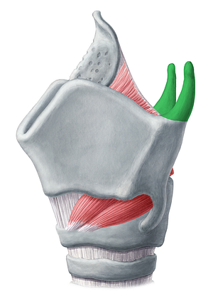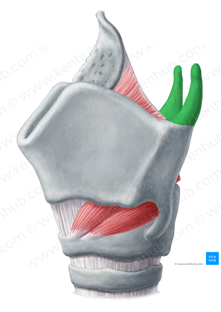 Shown from lateral left perspective. Also known as Hyoid horn of thyroid cartilage, Hyoid cornu of thyroid cartilage, and Superior cornu of thyroid cartilage.