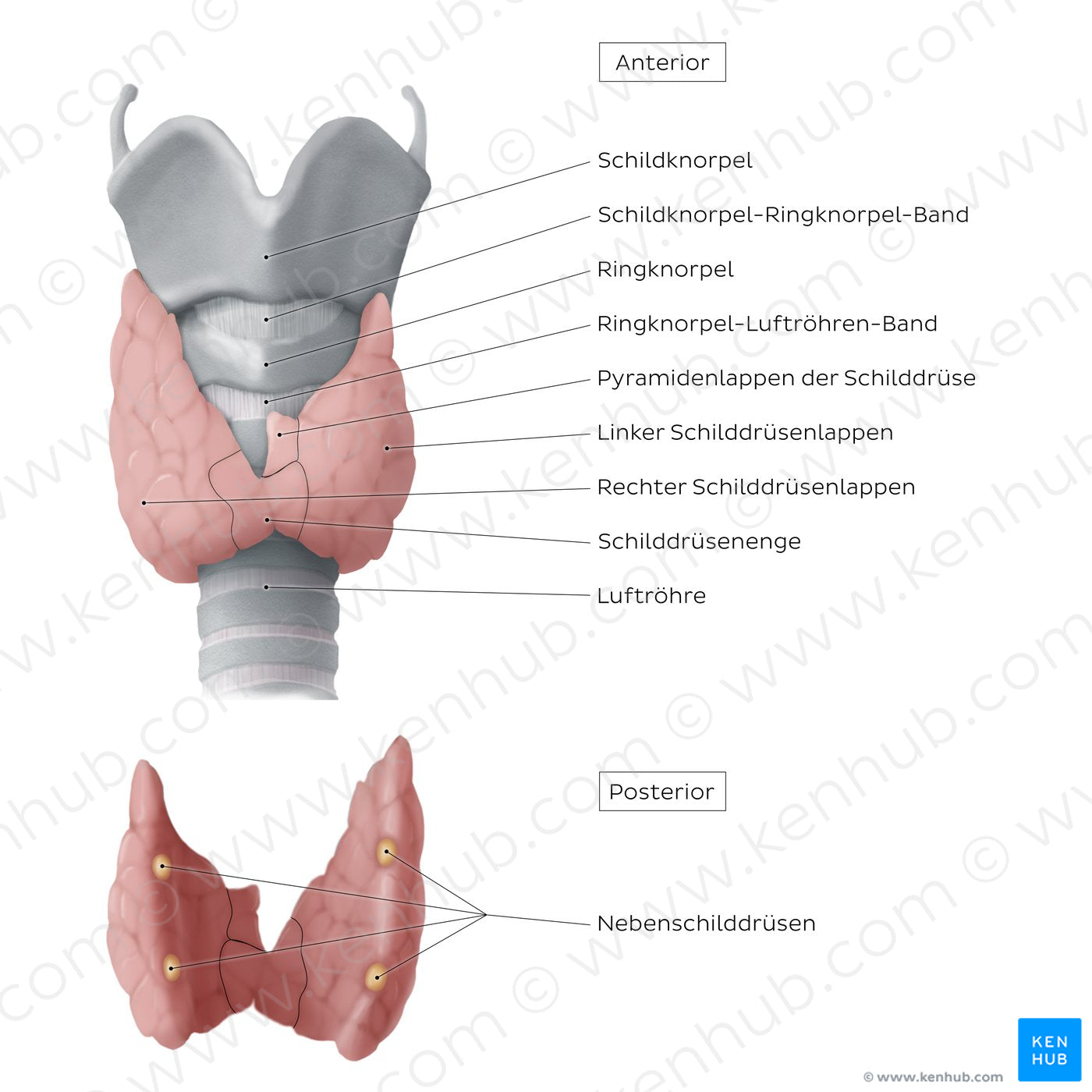 Oberes Bild: Vorderansicht der Schilddrüse mit freiliegendem Schildknorpel und dem zervikalen Teil der Luftröhre. Die schmetterlingsförmige Schilddrüse besteht aus einem linken und einem rechten kegelförmigen Lappen, die durch einen zentralen Isthmus verbunden sind. Gelegentlich kann ein dritter pyramidaler Lappen vorhanden sein. Die Schilddrüse befindet sich vor der Luftröhre und unterhalb des Schildknorpels.Unteres Bild: Hintere Ansicht der Schilddrüse mit Darstellung der vier Nebenschilddrüsen. Ein Paar von linsenförmigen Nebenschilddrüsen befinden sich auf der Rückseite jedes Schilddrüsenlappens. Je nach ihrer Lage werden sie als obere und untere Nebenschilddrüsen bezeichnet.