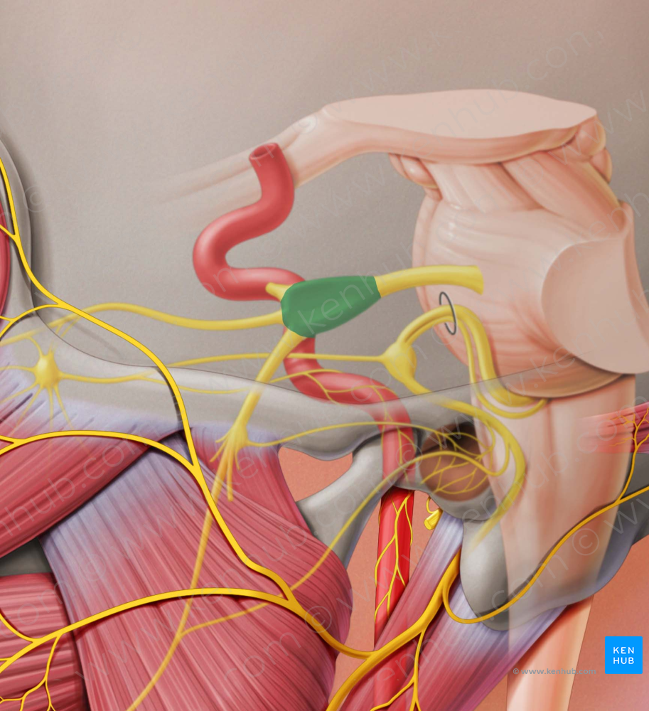 Shown from lateral left perspective. Also known as Gasserian ganglion, Semilunar ganglion, and Gasser's ganglion.