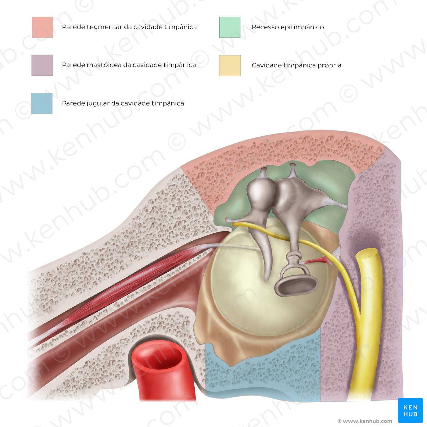 : Corte sagital da orelha média em uma vista medial. A cavidade timpânica possui duas partes principais: a cavidade timpânica própria e o recesso epitimpânico. A cavidade timpânica própria se localiza medialmente à membrana timpânica, enquanto o recesso epitimpânico é encontrado acima do nível da membrana timpânica, próximo às células mastóideas. O formato da cavidade timpânica se assemelha a um cubo, contendo 6 paredes: membranosa, tegmental, jugular, mastóidea, labiríntica e carótida A parede membranosa (lateral) é formada pela membrana timpânica e pela parte escamosa do osso temporal. A parede labiríntica (medial) separa a cavidade timpânica do labirinto. A parede tegmental (teto) é uma fina placa de osso que separa a cavidade timpânica da cavidade craniana, enquanto a parede jugular (assoalho) a separa da veia jugular e da artéria carótida, localizados abaixo. A parede carotídea (anterior) corresponde ao canal carotídeo e contém a abertura timpânica da tuba auditiva, enquanto a parede mastóidea (posterior) separa a cavidade timpânica do antro mastóideo.