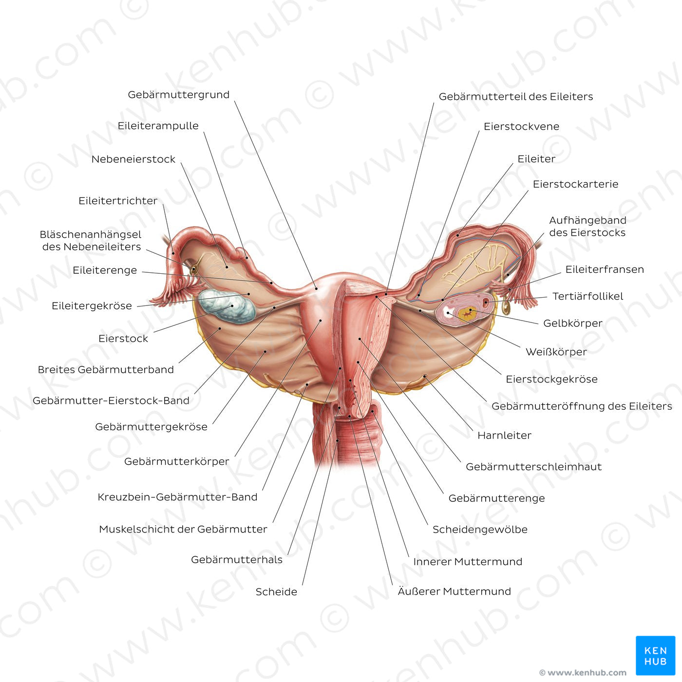 Die Übersicht zeigt die inneren Organe des weiblichen Fortpflanzungssystems. Auf der rechten Seite ist ein Querschnitt des Eierstockes zu sehen, in dem die verschiedenen Reifungsstadien der Follikel zu erkennen sind. Wenn ein Follikel vollständig gereift ist, kommt es zum Eisprung und eine Eizelle wird in den Eileiter abgestoßen. Jeder Eileiter besteht aus 4 Teilen: dem Eileitertrichter, der Eileiterampulle (in der die Eizellen normalerweise befruchtet werden), dem Isthmus und dem intramuralen Teil. Die Gebärmutter hat 3 Schichten: die Gebärmutterschleimhaut, die Muskelschicht der Gebärmutter und den Bauchfellüberzug. Die Gebärmutter, die Eileiter und die Eierstöcke werden von verschiedenen Bändern zusammengehalten: inferior durch das Kreuzbein-Gebärmutterband, seitlich durch das Gebärmutter-Eierstock-Band, das Aufhängeband des Eierstocks und das breite Gebärmutterband. Das wichtigste Band ist das breite Gebärmutterband, welches in 3 Teile unterteilt ist: das Gebärmuttergekröse, das Eileitergekröse und das Eierstockgekröse.