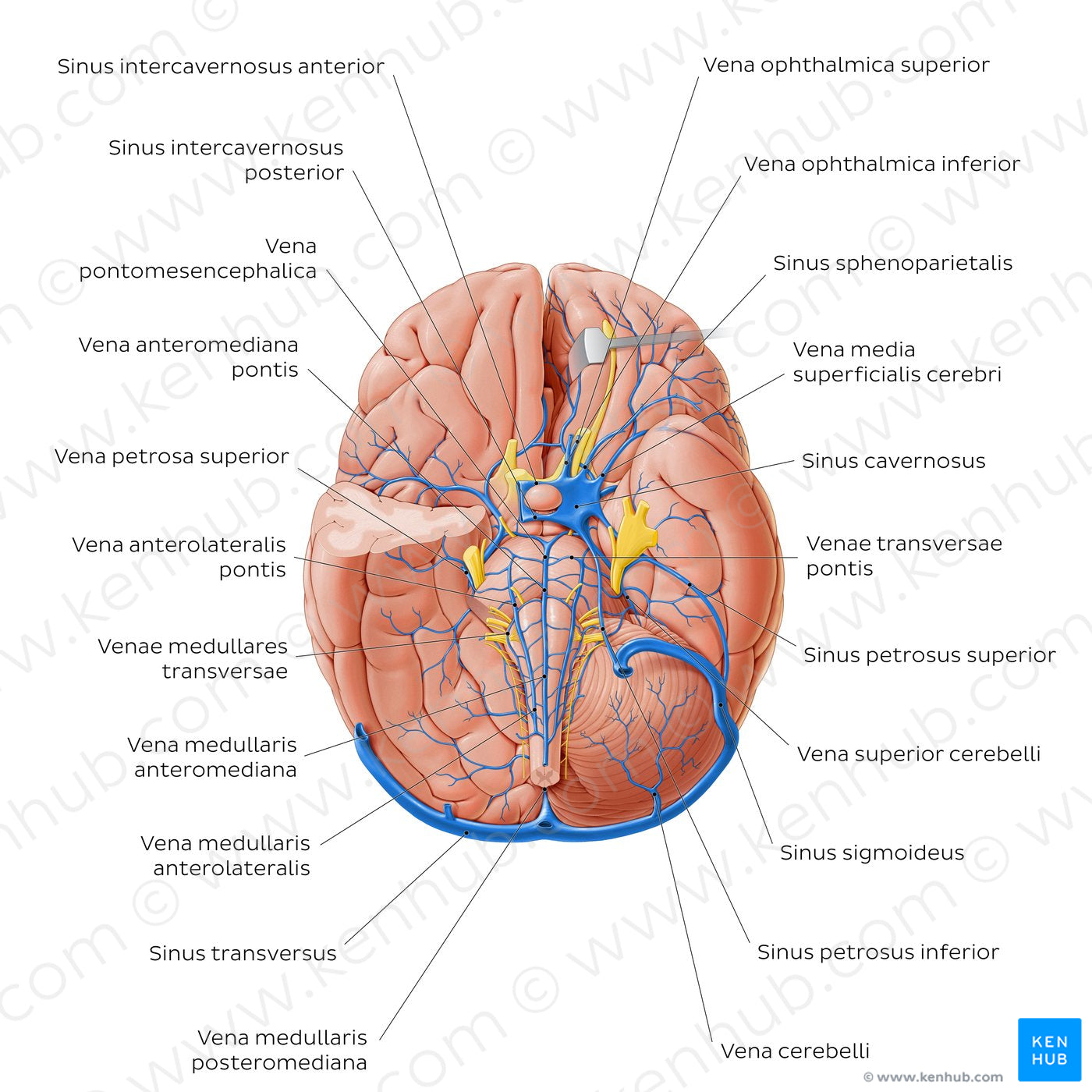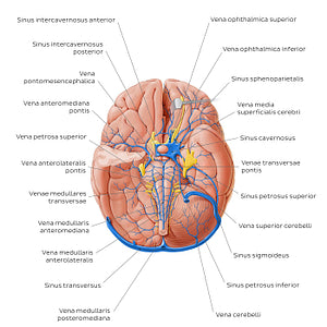Venous drainage of the cerebellum is achieved through the v. superior cerebelli and v. inferior cerebelli, the v. cerebelli (v. precentralis cerebelli) and the v. petrosa. The vv. superiores cerebelli mainly drain the superior region of the cerebellum and empty into the sinus rectus, v. magna cerebri (Galeni) (see previous image), the sinus transversus and/or the sinus petrosus inferior. It is formed by the vv. inferiores cerebelli, also known as the vv. internae cerebelli and their tributaries drain blood from the inferior cerebellum into the right and left sinuum sigmoideae, sinus petrosus inferior, sinus occipitalis and sinus rectus (see previous image). Venous drainage of the brainstem (truncus encephali) involves a superficial plexus of veins which drain blood from the mesencephalon, pons and medulla oblongata to the vv. vertebrales, vv. medullae spinalis, and the sinus transversus and sinus petrosus inferior, as well as into the v. basalis and v. magna cerebri (Galeni) (see previous images).