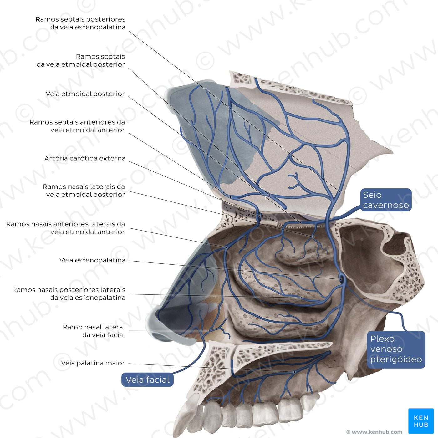 As veias nasais (efenopalatina, facial e oftálmica) seguem os trajetos das artérias, formando um rico plexo venoso dentro da mucosa da cavidade nasal, particularmente na extremidade posterior do meato nasal inferior (plexo de Woodruff). As veias da cavidade nasal possuem três pontos principais de drenagem: a veia facial, o seio cavernoso e o plexo venoso pterigóideo. A veia esfenopalatina e suas tributárias geralmente atravessam o forame esfenopalatino para drenar no plexo venoso pterigóideo. A veia palatina maior drena o palato duro e a gengiva, e entra na fossa infratemporal para também drenar no plexo venoso pterigóideo. As veias etmoidais drenam o teto, a região septal superior e paredes laterais da cavidade nasal, os seios etmoidais, o dorso do nariz e a dura-máter. A veia etmoidal posterior e suas tributárias se esvaziam no seio cavernoso, enquanto a veia etmoidal anterior e suas tributárias drenam nas veias facial ou oftálmica superior.