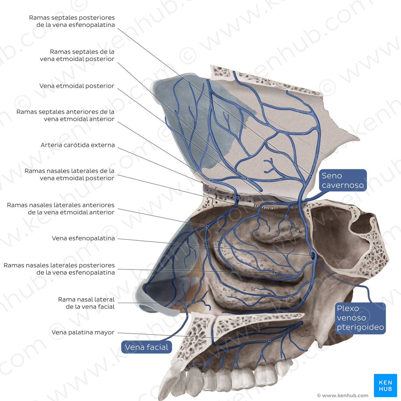 Las venas nasales (esfenopalatina, facial y oftálmica) siguen el mismo curso que las arterias nasales, formando un rico plexo venoso dentro de la mucosa de la cavidad nasal, particularmente en el extremo posterior del meato nasal inferior (plexo de Woodruff). Las venas de la cavidad nasal tienen tres puntos de drenaje: las venas facial, el seno cavernoso y el plexo venoso pterigoideo. La vena esfenopalatina y sus afluentes asociadas generalmente viajan hacia el foramen esfenopalatino para drenar en el plexo venoso pterigoideo. La vena palatina mayor drena el paladar duro y la encía y entra en la fosa infratemporal para también drenar en el plexo venoso pterigoideo. Las venas etmoidales drenan el techo y las paredes lateral y septal de la cavidad nasal, las celdillas etmoidales, el dorso de la nariz y la duramadre. La vena etmoidal posterior y sus afluentes asociadas drenan en el seno cavernoso mientras que la vena etmoidal anterior y sus afluentes drenan en la vena oftálmica superior o facial.