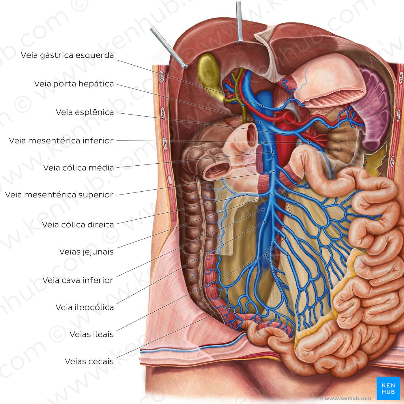 Visão geral do abdome com o fígado tracionado e partes do estômago, pâncreas e intestino grosso removidos. A drenagem venosa do intestino delgado é mais variável e não é tão bem descrita quanto a irrigação arterial, mas geralmente tende a seguir o mesmo padrão das artérias. A veia mesentérica superior, entretanto, drena primeiramente para a veia porta hepática ao invés da veia cava inferior. O sangue então segue pelo sistema venoso portal até o fígado, onde nutrientes e toxinas são removidos, antes de drenar para a veia cava inferior.