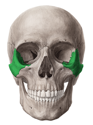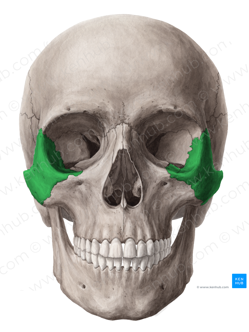 Shown from anterior perspective. Also known as Zygoma, and Malar bone.