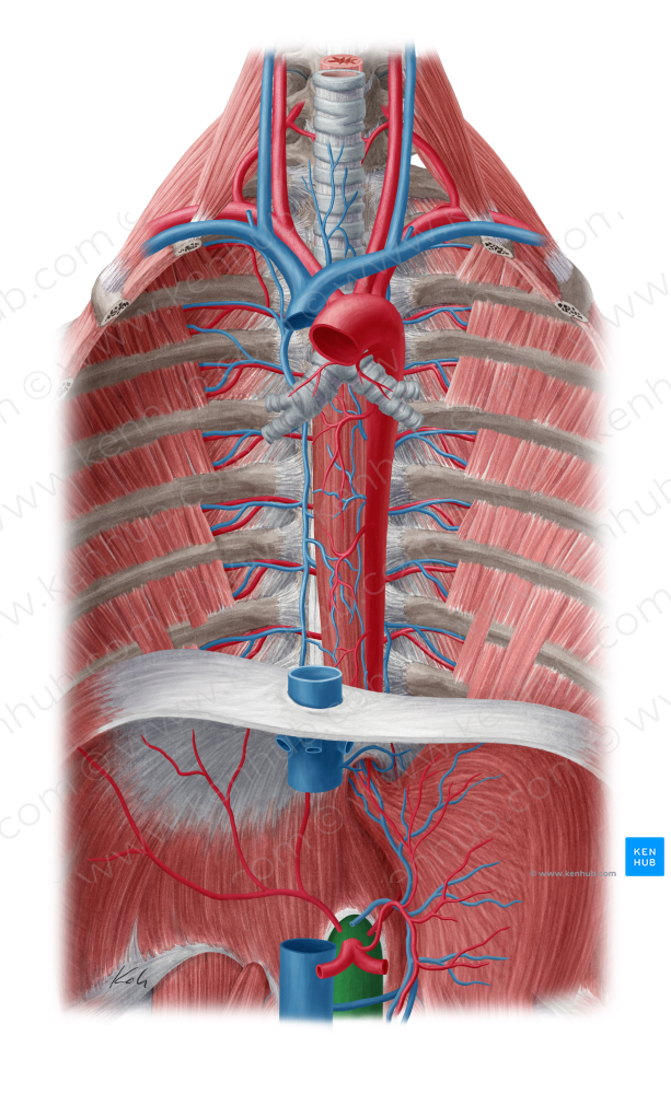 Shown from anterior perspective. Also known as Abdominal part of aorta.