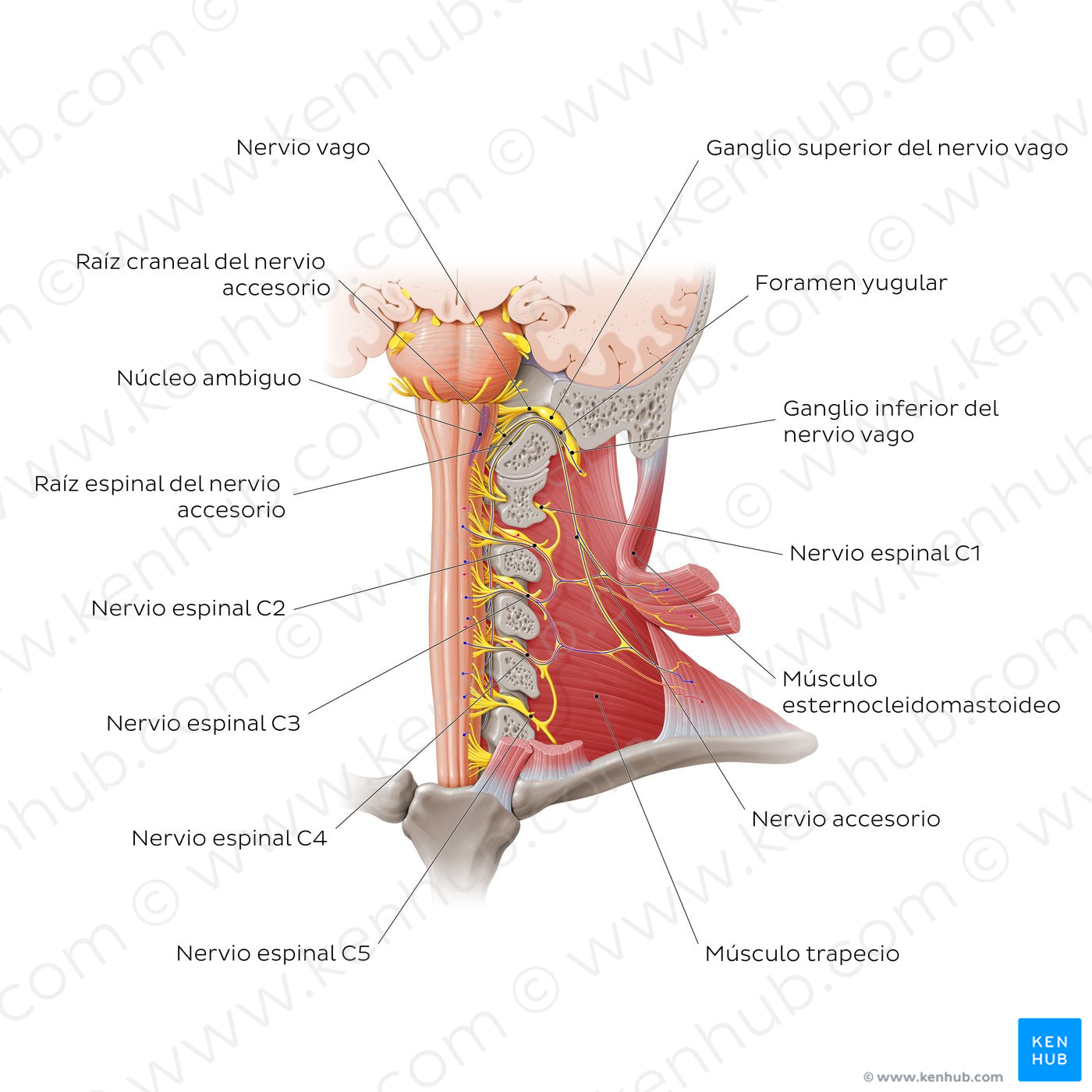 La raíz espinal del nervio accesorio se origina de los cuerpos celulares de las neuronas motoras ubicadas en los segmentos cervicales C5-C6 de la médula espinal, que en conjunto forman el núcleo del nervio accesorio. Múltiples raicillas salen de la médula espinal entre las raíces anteriores y posteriores del nervio espinal, y se unen para formar el tronco del nervio accesorio, que se dirige hacia arriba por la médula espinal y pasa a través del foramen magno para entrar al cráneo. La raíz craneal surge de las neuronas motoras en el núcleo ambiguo del bulbo raquídeo. Las raicillas de este núcleo salen del bulbo raquídeo y se unen temporalmente a las fibras de la raíz espinal. Saliendo juntas del cráneo a través del foramen yugular. Luego, el nervio se divide nuevamente en dos: el ramo interno (raíz craneal), el cual se une al nervio vago para inervar los músculos del paladar blando y la laringe, y el ramo externo (raíz espinal) se dirige hacia abajo en la región cervical lateral, pasando superficialmente a través del triángulo posterior del cuello. Aquí, el nervio accesorio pasa profundo al músculo esternocleidomastoideo, al cual inerva por medio de un ramo muscular. Este continúa descendiendo en dirección posterolateral, antes de dividirse en múltiples ramos terminales/ramos para el trapecio que se extienden a través del músculo trapecio, proporcionándole su función motora.La inervación adicional de los músculos esternocleidomastoideo y trapecio está dada también por ramos homónimos del plexo cervical. Estos ramos contienen fibras aferentes y neuronas sensitivas, cuyos cuerpos están ubicados en el ganglio espinal de los nervios espinales C2-C4. Se cree que algunas fibras motoras son transportadas hacia los músculos por esta vía.