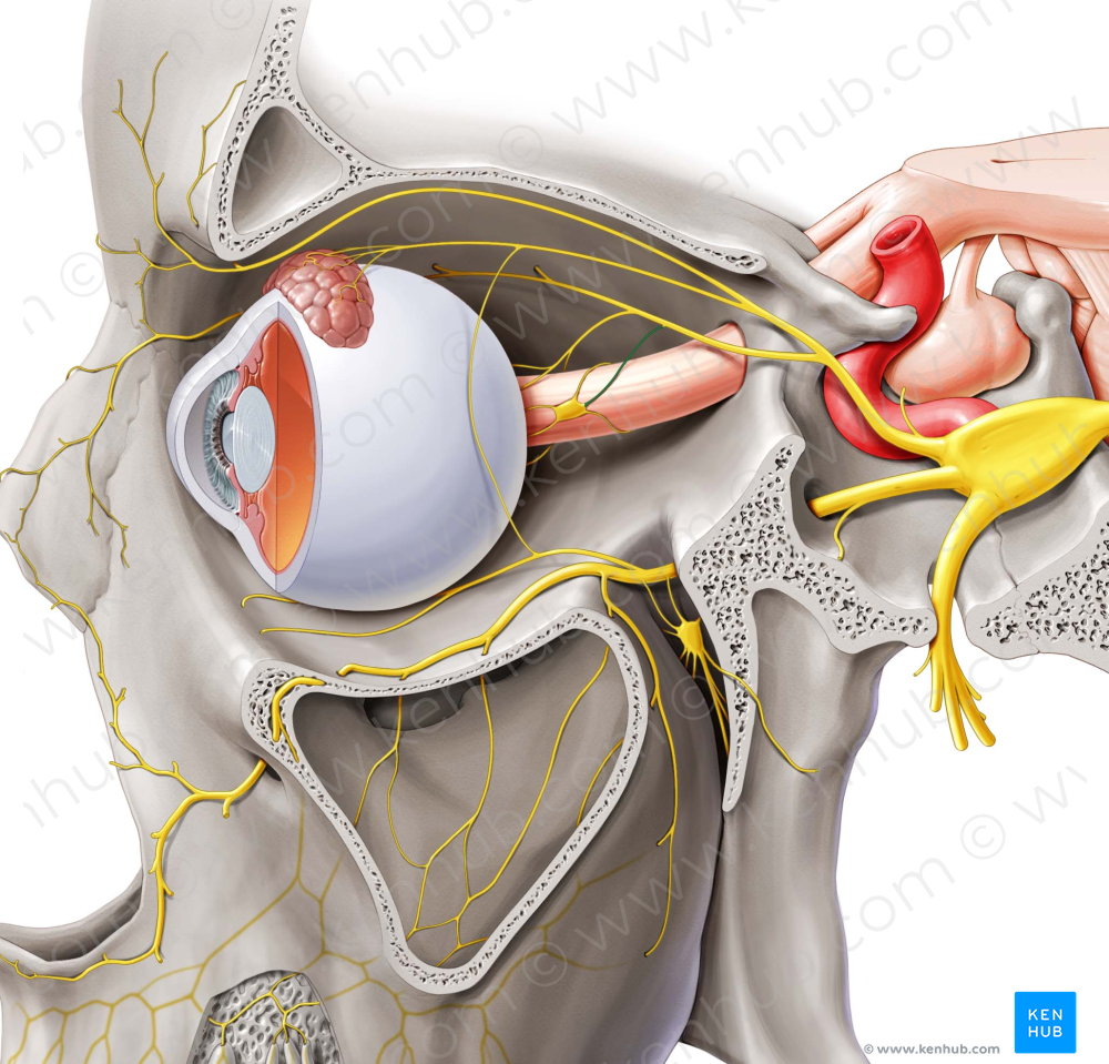 Shown from lateral left perspective. Also known as Sensory root of ciliary ganglion, Nasociliary root of ciliary ganglion, and Communicating branch of nasociliary nerve with ciliary ganglion.