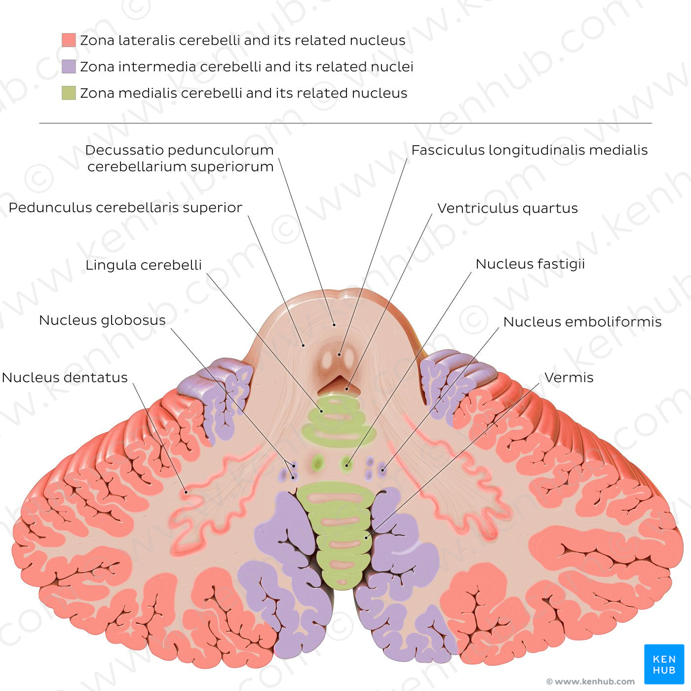 Section through the pedunculus cerebellaris superior and cerebellum, with the regiones corticales color coded to match their target nuclei. The most medial nucleus is the ncl. fastigii (a.k.a. ncl. medialis cerebelli), which lies with its contralateral fellow close to the midline. It is functionally related to the zona medialis (a.k.a. zona vermalis) of the overlying cortex cerebellaris. Lateral to the ncl. fastigii are the ncl. emboliformis and ncl. globosus, which are alternatively referred to as the ncll. interpositii anterior et posterior, respectively. These nuclei are functionally related to the zona intermedia (a.k.a. zona paravermalis) of the cortex cerebellaris.The ncl. dentatus (a.k.a. ncl. lateralis cerebelli) is the largest and most expansive of the ncll. cerebellares; its size correlates to the large overlying zona lateralis, to which it relates. It presents as an undulating layer of gray matter lateral to the ncl. interpositii, which gives it a somewhat ‘crumpled’, flask-like appearance. Its opening, known as the hilum ncl. dentati, is oriented anteromedially towards the pedunculus cerebellaris superior, to which its efferent fibers project. It can be further subdivided into pars dorsalis/motoria/microgryia and pars ventralis/nonmotoria/macrogyria which are said to play a major role in the modulation of voluntary movement and cognitive/visuospatial processes, respectively.
