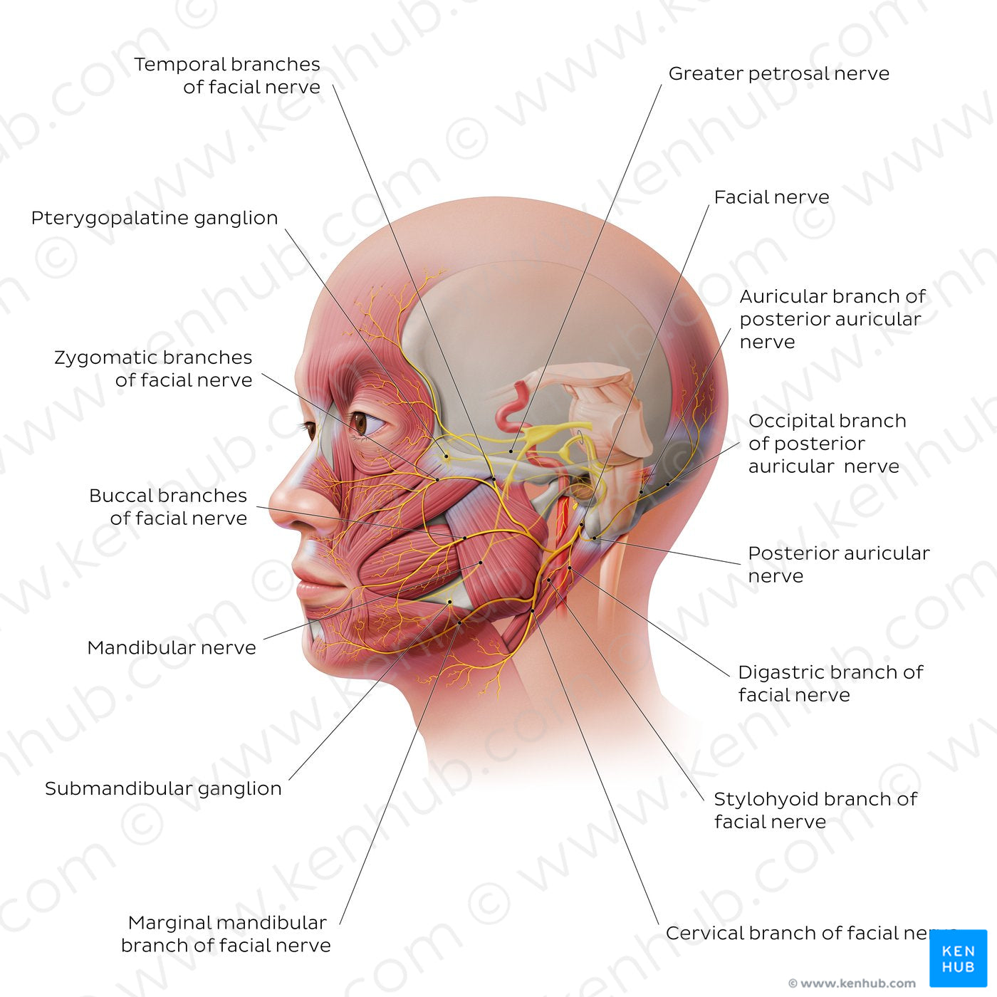 After it emerges from the stylomastoid foramen, the facial nerve gives off the posterior auricular nerve (which provides motor innervation to the occipital part of occipitofrontalis muscle and auricular muscles, as well as sensory innervation to the variable amounts of the auricle and retroauricular region), as well as other motor branches to the digastric (posterior belly) and stylohyoid muscles. It then enters the parotid gland and bifurcates into two trunks, which give off five terminal branches collectively known as the parotid plexus. These are the temporal, zygomatic, buccal, marginal mandibular, and cervical branches, all of which innervate the muscles of facial expression but do not innervate the parotid gland itself.
