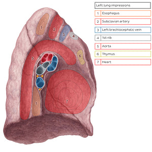 The most prominent impression seen on the medial surface of the left lung is the cardiac impression, while smaller impressions include the grooves for the aorta, subclavian artery, 1st rib, esophagus and left brachiocephalic vein.