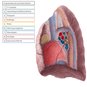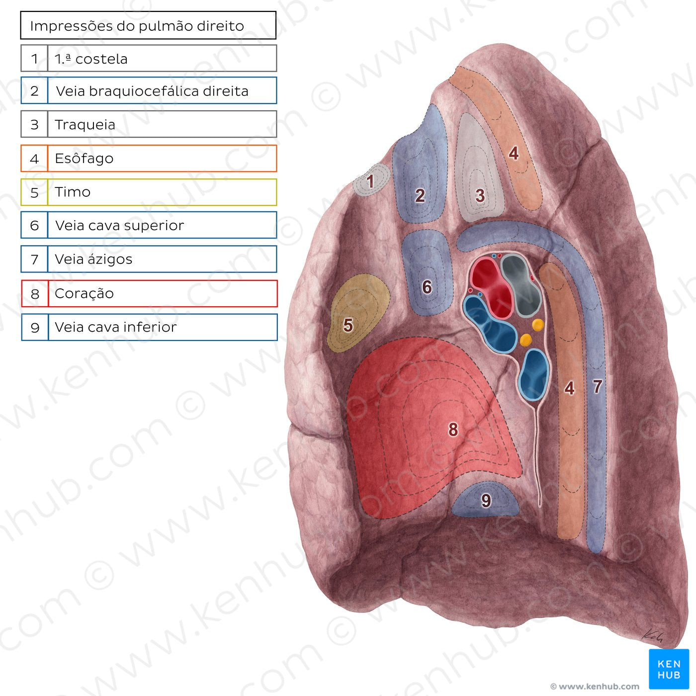 Devido à presença de outros órgãos na cavidade torácica, as superfícies pulmonares são marcadas por impressões dos órgãos e estruturas adjacentes. A superfície medial do pulmão direito é marcada por várias impressões de órgãos adjacentes. As mais proeminentes delas incluem as impressões da veia ázigos, da veia cava superior, da veia braquiocefálica direita, da traqueia e do esôfago, assim como o sulco para a primeira costela.