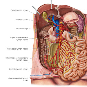 Overview of the abdomen with the liver reflected and stomach, pancreas and parts of the large intestine removed. The lymph nodes of the small intestine compose one the largest groups in the body, consisting of 100-150 nodes dispersed throughout the mesentery. The juxtaintestinal lymph nodes are located peripherally close to the ileal and jejunal wall. From here, lymph is transported towards the superior mesenteric lymph nodes via intermediate mesenteric nodes located alongside the jejunal and ileal arteries. Pancreaticoduodenal lymph nodes drain most of the duodenum. Lymph is then transported to the celiac and superior mesenteric nodes before reaching the cisterna chyli and continuing into the thoracic duct.