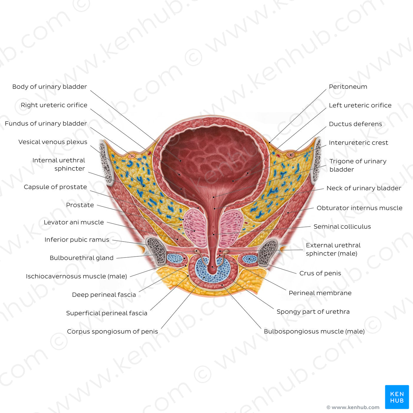 A coronal section of the male urinary bladder and surrounding structures. This section displays the body, fundus and neck of the bladder. Several main internal features of the bladder are visible, such as the trigone, left and right ureteric orifices, interureteric crest and the uvula of the urinary bladder. The neck of the male urinary bladder lies superior to the prostate, and extends into its parenchyma as the urethra.