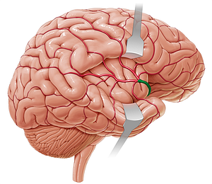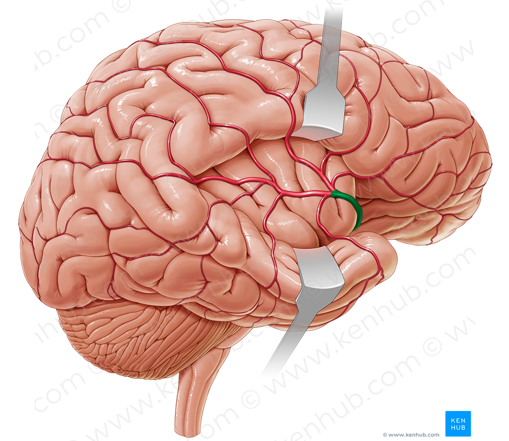 Shown from lateral right perspective. Also known as MCA, and Sylvian artery.