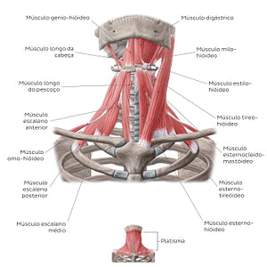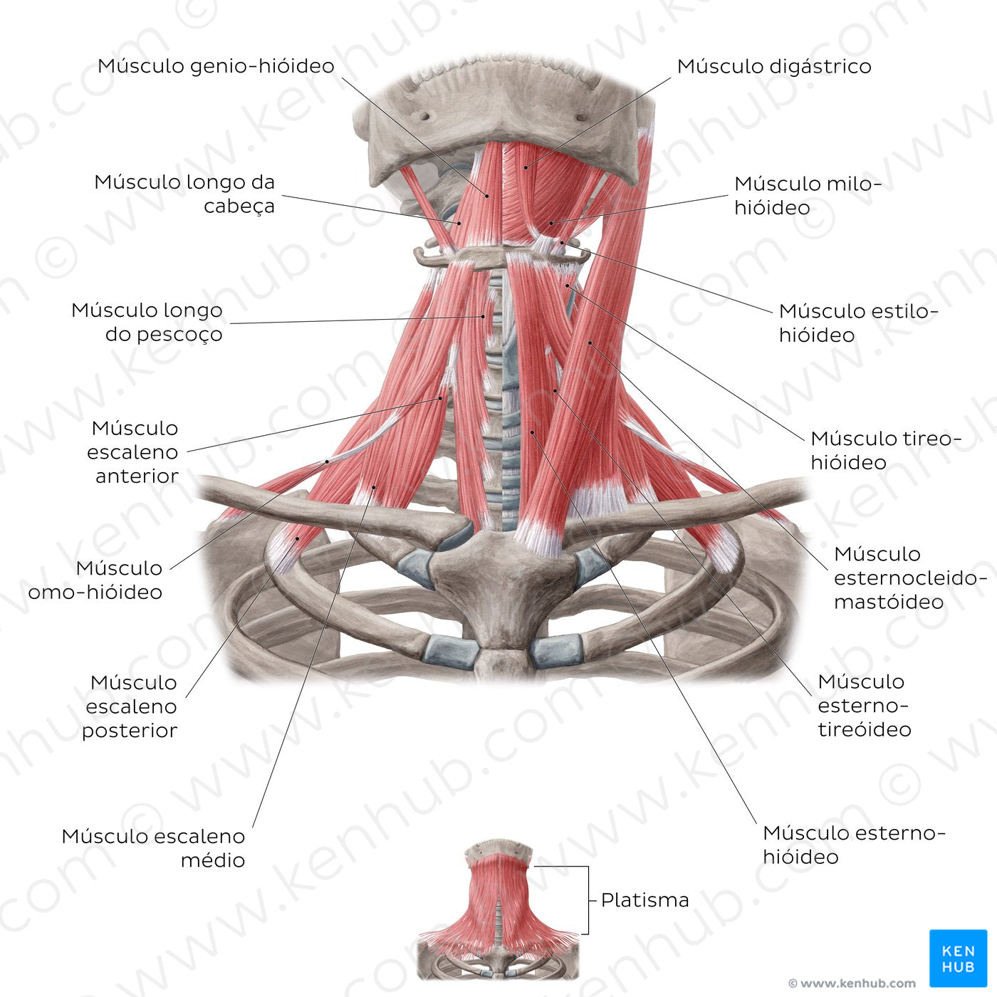 Visão anterior da região do pescoço com o osso hioide e os músculos supra-hióideos e infra-hióideos expostos. O osso hioide serve como local de fixação para vários músculos. Enquanto os músculos supra-hióideos (músculo digástrico, milo-hióideo, gênio-hióideo e estilo-hióideo) se inserem na superfície superior do osso hioide, os músculos infra-hióideos (músculo omo-hióideo, esterno-hióideo, esternotireóideo e tireo-hióideo) se inserem em sua superfície inferior. Esses músculos auxiliam na elevação e depressão do osso hioide, facilitando a abertura da mandíbula e a deglutição.Os músculos faríngeos e extrínsecos da língua, como o constritor medial da faringe, o hioglosso e o condroglosso (não representados), também surgem do osso hioide e auxiliam na deglutição