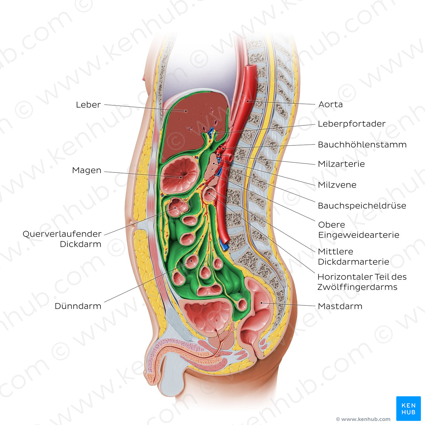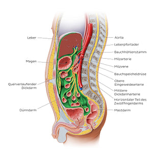 Sagittalschnitt durch das Abdomen. Intraperitoneale Organe sind vollkommen vom Peritoneum umschlossen. Dazu gehören Leber, Milz, Magen, oberer Anteil des Zwölffingerdarms, Leerdarm, Krummdarm, querverlaufender Dickdarm, Sigmoid und oberer Anteil des Mastdarms.Retroperitoneale Organe sind die Organe hinter dem parietalen Bauchfell im Spatium retroperitoneale und nur ihre vordere Wand wird vom parietalen Bauchfell bedeckt. Wenn sie sich außerhalb des Peritonealraums entwickelt haben und dort auch verbleiben, werden die als primär retroperitoneal gelegene Organe bezeichnet. Dazu gehören: Nieren, Nebennieren und Harnleiter. Sekundär retroperitoneal gelegene Organe entwickeln sich ursprünglich innerhalb des Peritonealraums, verlieren dann allerdings ihr Mesenterium während der Embryonalentwicklung und verlagern sich so in den Retroperitonealraum: Bauchspeicheldrüse, Distaler Teil des Zwölffingerdarms, aufsteigender/absteigender Dickdarm. Die großen Blutgefäße (Bauchaorta, untere Hohlvene) sind auch retroperitoneal gelegen.