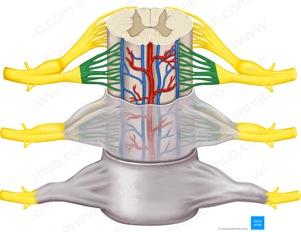 Shown from anterior perspective. Also known as Rootlets of ventral root, and Motor rootlets.