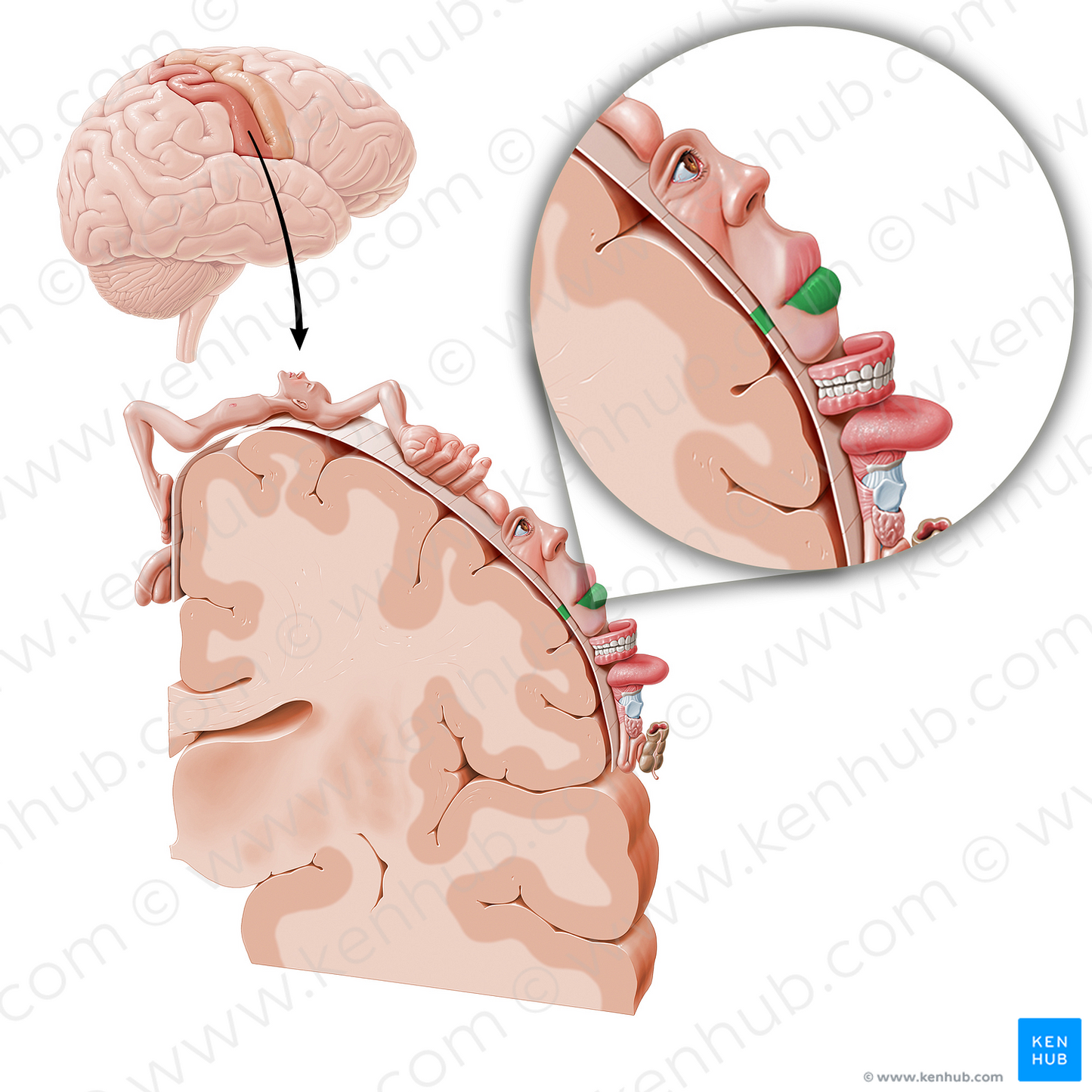 Shown from coronal perspective. Also known as Somatosensory cortex of lower lip.