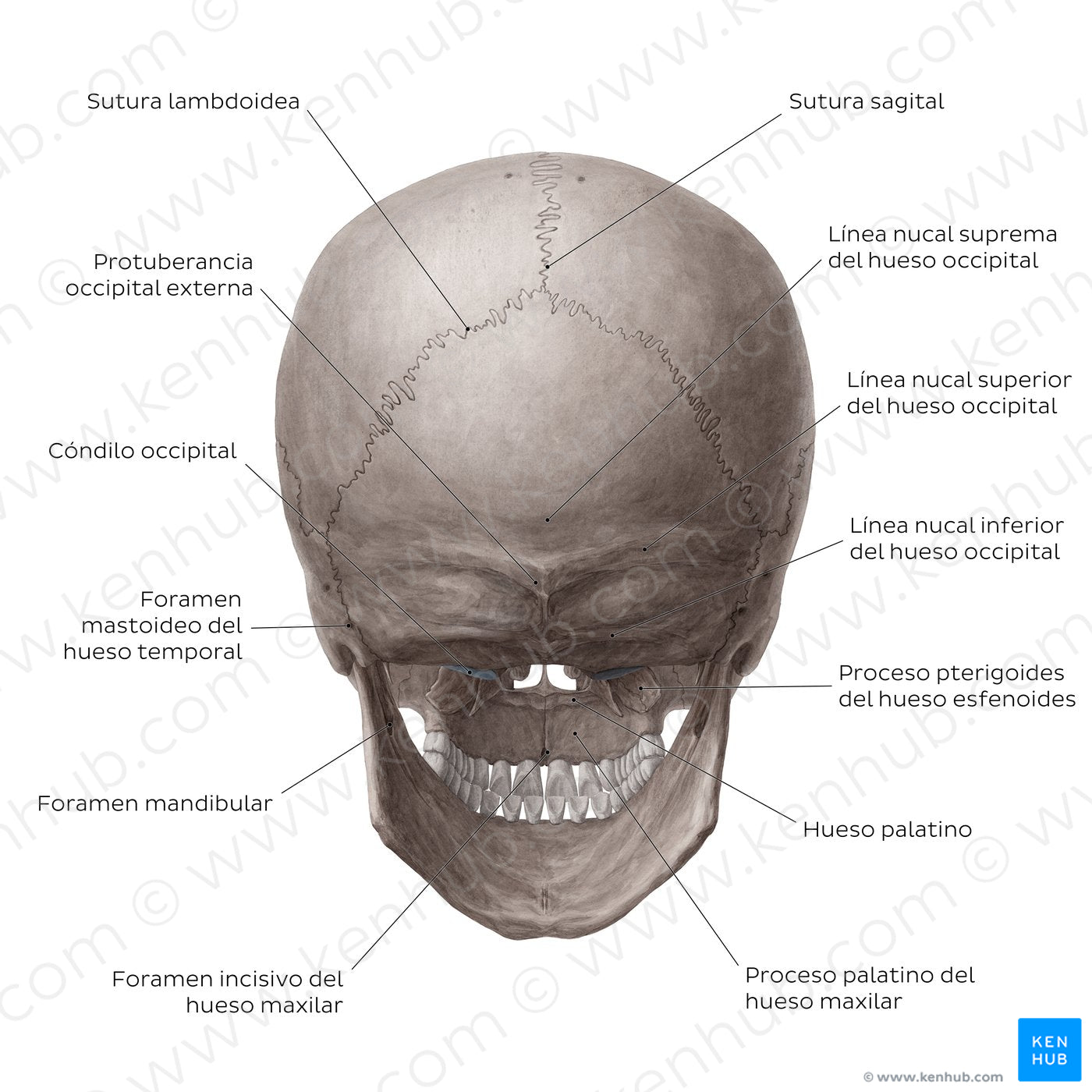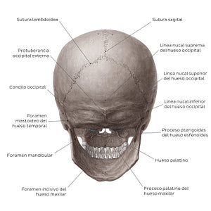 La vista posterior está ocupada principalmente por la porción escamosa del hueso occipital y la cara posterior de los huesos parietales. Los dos huesos parietales se unen en la línea media y forman la sutura sagital. Cada hueso parietal se articula también con el hueso occipital para formar la sutura lambdoidea. Los principales reparos óseos del hueso occipital son visibles en esta vista, principalmente la línea nucal suprema, superior e inferior, la protuberancia occipital externa y los cóndilos occipitales. El resto de la cara posterior del cráneo está ocupado por los aspectos posteriores de los maxilares y la mandíbula, y parte de los huesos palatino y esfenoides.