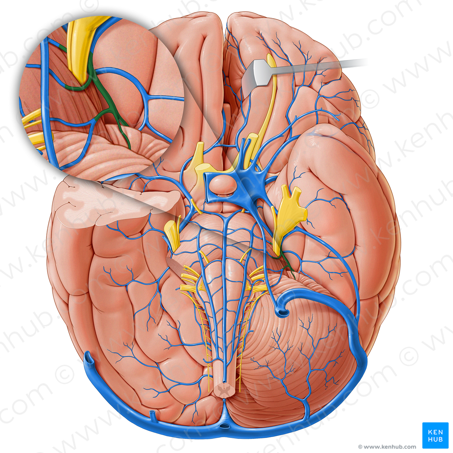 Shown from inferior perspective. Also known as Superior vein of cerebellar hemisphere.