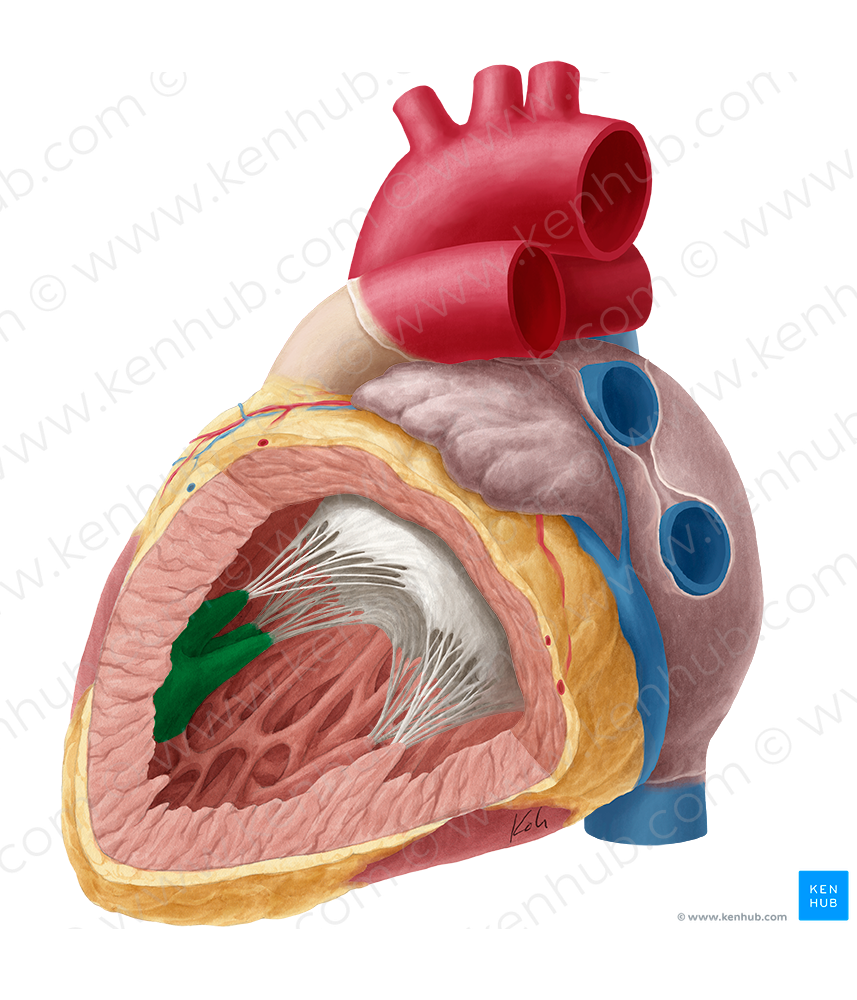 Shown from inferior perspective. Also known as Superolateral papillary muscle of left ventricle, and Anterior papillary muscle of left ventricle.