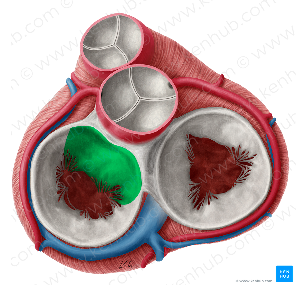 Shown from superior perspective. Also known as Aortic leaflet of left atrioventricular valve, Anteromedial leaflet of left atrioventricular valve, Septal leaflet of left atrioventricular valve, Greater leaflet of left atrioventricular valve, Anterior cusp of left atrioventricular valve, and Anterior leaflet of mitral valve.