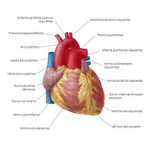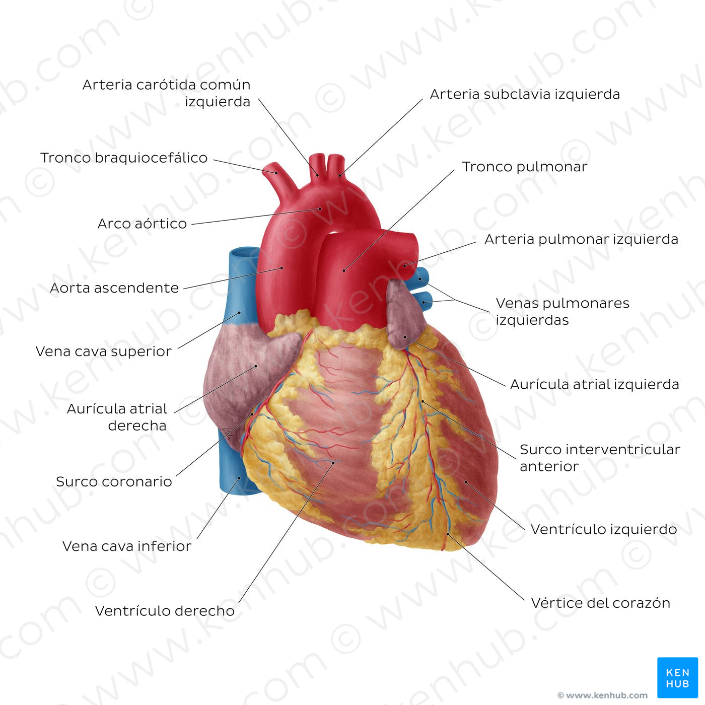 La cara anterior del corazón mira anterosuperiormente y presenta una profunda convexidad derecha en comparación a la izquierda. El ventrículo derecho ocupa cerca de dos tercios de su extensión, mientras que el ventrículo izquierdo forma el tercio restante. Las raíces de la aorta y del tronco pulmonar ocultan en gran parte al atrio izquierdo, permitiendo observar solo una porción de la aurícula izquierda. Los atrios y ventrículos están separados por un surco profundo llamado surco coronario que contiene el vaso cardíaco más grande; este se encuentra interrumpido anteriormente por la raíz del tronco pulmonar. La cara anterior está marcada por otro surco, llamado el surco interventricular anterior, que separa los ventrículos derecho e izquierdo y contiene la arteria y vena interventricular anterior. En esta imagen también podemos ver el contorno de la cara derecha (pulmonar) del corazón, que es más larga y más protuberante que la cara izquierda. Se encuentra formada por el atrio derecho superiormente y el ventrículo derecho inferiormente.