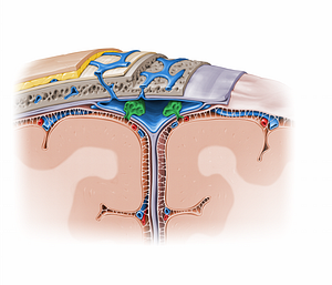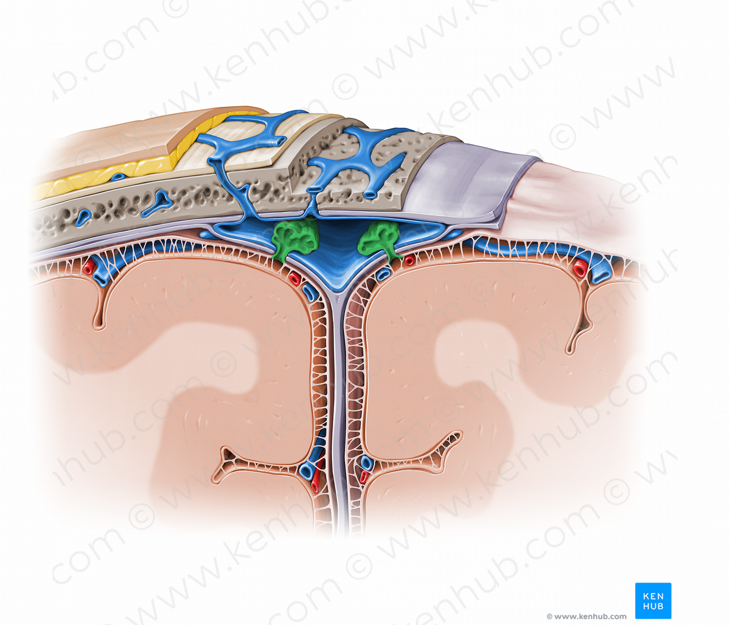 Shown from coronal perspective. Also known as Arachnoid villi, and Pacchionian granulations.