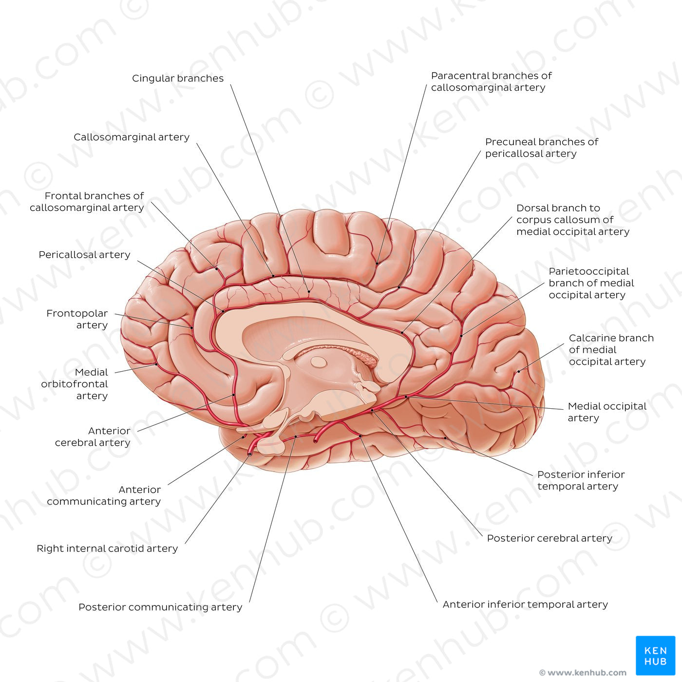 Cerebrum (without the brainstem and cerebellum) with arteries exposed. The anterior cerebral artery (ACA) gives off several branches including the anterior communicating artery, anteromedial central artery, orbitofrontal branches (i.e. medial/posterior), frontopolar, callosomarginal and pericallosal arteries. The callosomarginal artery also gives rise to three frontal branches (anteromedial, intermediomedial and posteromedial), as well as several cingular branches, while the pericallosal artery gives rise to the precuneate and other parietal branches. Therefore, the anterior cerebral artery supplies the frontal and medial surfaces of the cerebrum, cingulate cortex and part of the corpus callosum. The posterior cerebral artery (PCA) gives off several branches which include: the posteromedial and posterolateral central arteries, posterior choroidal branches, parietooccipital artery, lateral occipital and medial occipital arteries. The PCA and its branches supply the occipital lobe, the inferolateral surface of the temporal lobe, midbrain, thalamus, choroid plexus (third and lateral ventricle) and cerebral peduncles.