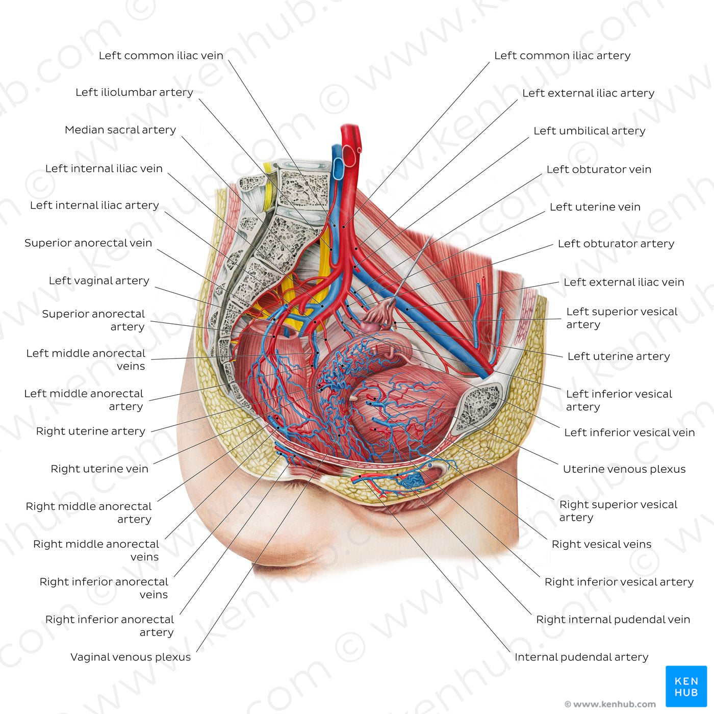 Sagittal view of the female pelvis. At the level of the sacroiliac joint, the bilateral common iliac artery bifurcates into the external and internal iliac arteries. The external iliac artery courses towards the thigh to continue as the femoral artery, whereas the internal iliac artery gives off multiple branches to supply the pelvic wall and viscera. It can be divided into anterior and posterior divisions. The branches of the posterior division are the iliolumbar, superior gluteal and lateral sacral arteries. The anterior division gives off the uterine, obturator, umbilical, vaginal, superior vesical, internal pudendal, middle anorectal and inferior gluteal arteries. The veins of the female pelvis collect blood from the urogenital organs and the rectum and drain into the internal iliac vein (or inferior mesenteric vein in the case of the superior [ano]rectal vein. From the internal iliac vein, the blood is transported to the common iliac vein and from there to the inferior vena cava. The right and left ovarian veins directly drain directly to the inferior vena cava and left renal vein, respectively.